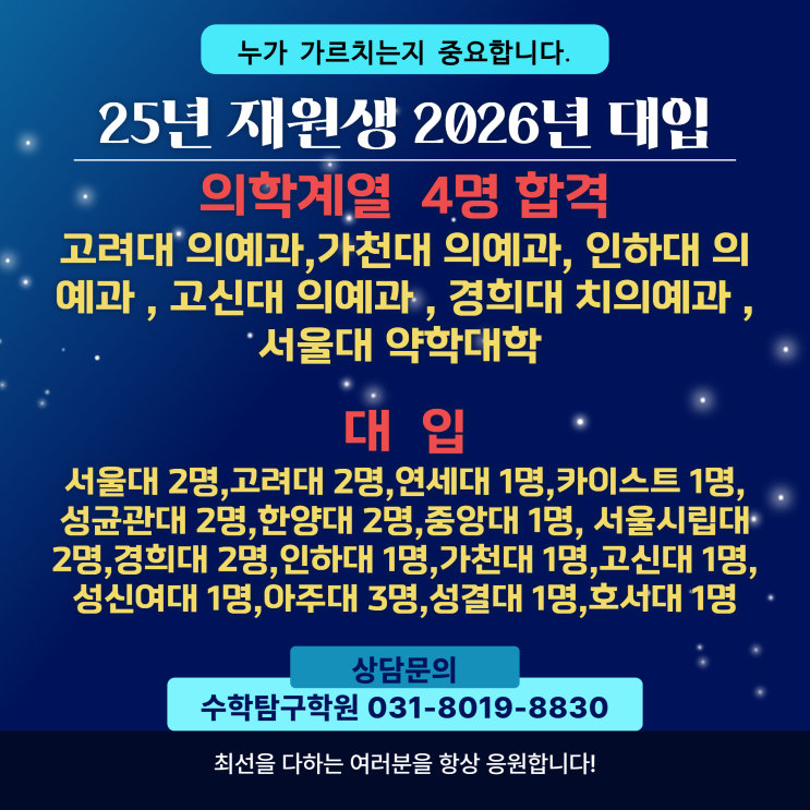 하나님께 모든 영광을 돌립니다. 6학년때 부터 고3이 되도록 저와 한번도 헤어짐 없이 같이 공부 해준 제자들이 이제 7년의 세월을 뒤로 하고 대학에 합격했습니다. 모두 하나님께서 하셨고 착하고 바른 학생들이 한결같이 열심히 해 주었고 믿고 맡겨주신 학부모님들 덕분입니다. 앞으로도 겸손히 하나님께서 맡겨주시는 학생들과 함께 열심히 공부하여 모든 영광은 하나님께 돌리는 해봄학원이 되겠습니다. 2025년 12월을 뒤로하며 이글을 씁니다. 감사합니다.