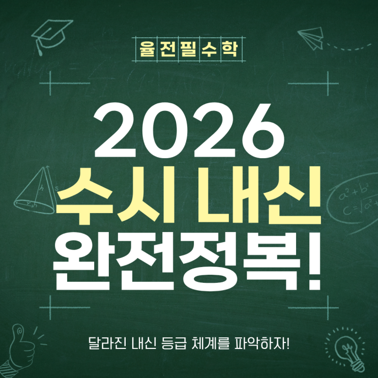 최근 중·고등 학부모님들 사이에서 “내신 등급이 바뀐다는데, 정확히 뭐가 달라진 건가요?” 라는 질문을 정말 많이 받습니다. 오늘은 수원 장안구 수학학원 율전필수학학원에서 핫 이슈, 새롭게 바뀌는 내신 등급 체계를 쉽게 정리해 드리겠습니다. ▼▼▼아래로 스크롤 쭉쭉 내려주세요!▼▼▼ 내신 등급 체계, 무엇이 달라졌나요? 기존 내신은 1등급부터 9등급까지 상대평가로만 나뉘는 구조였습니다. 하지만 앞으로는 5등급 상대평가 체계로 개편됩니다. ✔ 기존 내신 1등급 ~ 9등급 학생 간 성적 순위 중심 상위권 학생 간 변별력 과도 ✔ 변경 후 내신 1등급 ~ 5등급 상위권 변별은 유지하되 중·하위권 학생 부담 완화 등급 간 간격이 더....... <img src="https://blogthumb.pstatic.net/MjAyNjAxMDZfNzMg/MDAxNzY3NjYzNzM2ODE1.NmaYFKmhYYLAP0UxkJ40uOxpjNgkbsSRdCQD24w02Fog.5cHVlWBy4c72h5VaLA5FUcMGsnrXih5UkD3VHZTxx1gg.PNG/%BD%E6%B3%D7%C0%CF%BF%EB_%B4%A9%B8%AE_%282%29.png?type=s3" />