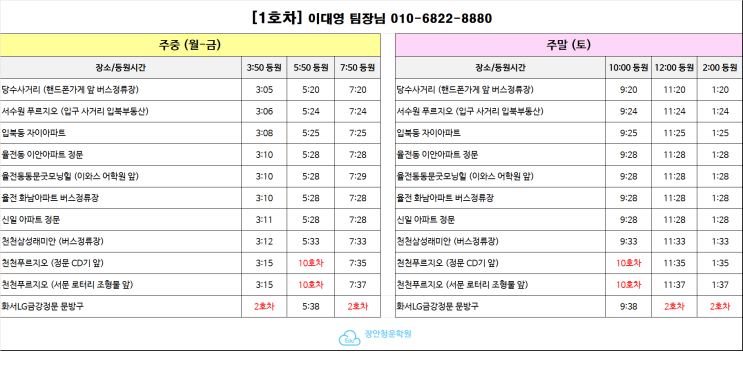*본 수업 시간 외에 탑승을 원할 시에는 해당 호차 기사님 혹은 학원으로 꼭 연락 부탁드립니다. *9호차와 10호차는 추가 차량으로 일부 시간에만 운행을 합니다. 해당 시간에 탑승하는 학생들은 차량 시간 확인 부탁드립니다. *차량 수용인원으로 인해 등원할 때 탑승하는 차량과 하원할 때 탑승하는 차량이 다른 코스가 있습니다. 등 하원차량이 변경되는 학생은 개별적으로 학원에서 안내문자가 발송 될 예정이오니 착오없이 탑승 부탁드립니다. <img src="https://blogthumb.pstatic.net/MjAyNjAyMjZfMjEw/MDAxNzcyMTA2NTY0NjEx.3acVDNaYcvz-OzU-WjQT3rwnroE-egPZnZ3poPoYlpkg.j4-l48SRpyBJef0K05ymOHWNzr05TITd88f8gsTrNJog.PNG/1%C8%A3%C2%F7.png?type=s3" />
