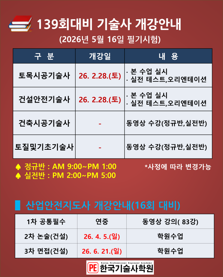수원역에 위치한 한국기술사학원이 139회 대비 기술사개강을 합니다. 넓은 책상과 강의실, 그리고 깨끗한 환경에 공부하세요. 특히 매년 많은 합격생을 배출하고 있습니다. 많은 성원바랍니다.~^^ <img src="https://blogthumb.pstatic.net/MjAyNjAyMDFfMTgx/MDAxNzY5OTA5NDA0MDAw.F7EoHdmjbUD740XxbTKhqnOb7nVXn1lh7qcUZRg0ooog.OTL5urYAqzAmAGakjm6yEfB5ZXOODVIp9yHUAPRe-Aog.PNG/%B0%B3%B0%AD%BE%C8%B3%BB.png?type=s3" />