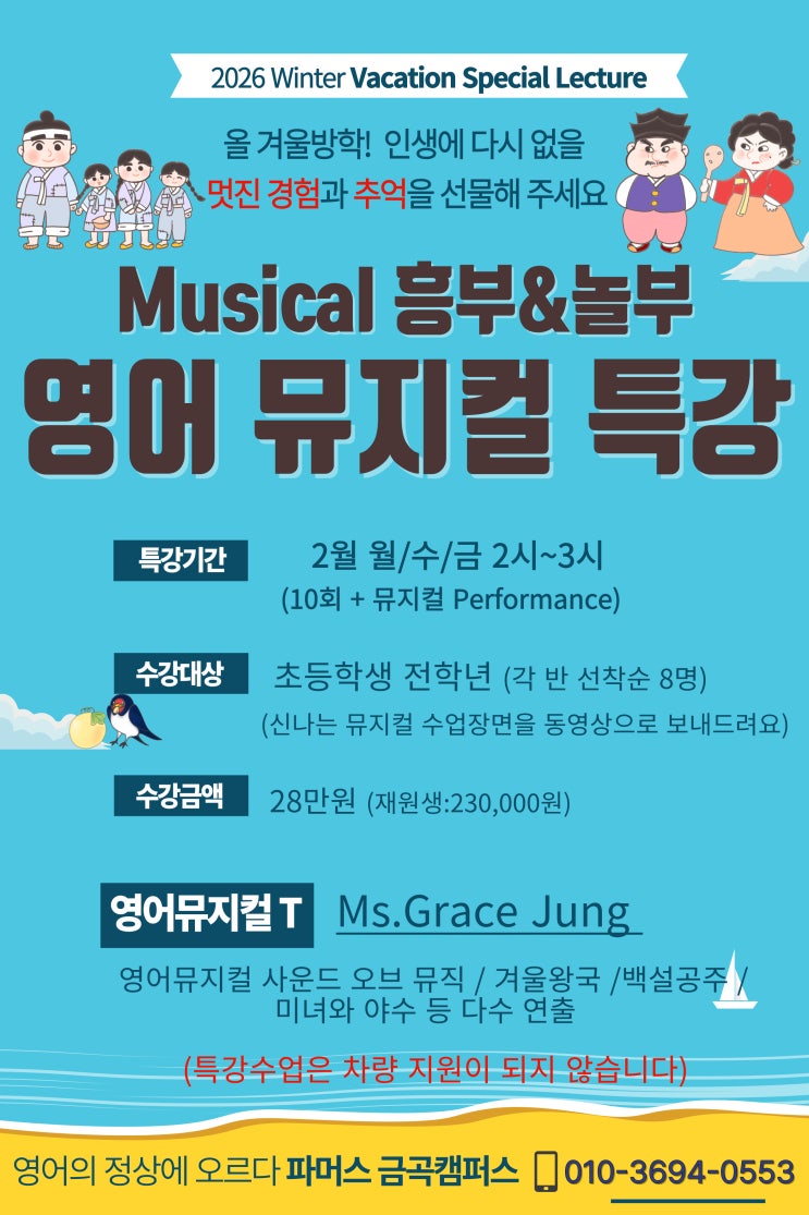 [특강안내] 겨울방학의 주인공은 나! "흥부와 놀부" 영어 뮤지컬 특강 개강 안녕하세요, 파머스영어 수원 금곡캠퍼스입니다! 길고 긴 겨울방학, 우리 아이들에게 *살아있는 영어: 단순히 외우는 영어가 아닌, 노래와 율동으로 몸소 익히는 체득형 학습 *자신감 Up!: 무대 위 주인공이 되어 보며 영어에 대한 두려움을 극복 *누구나 참여 가능: 파머스 재원생뿐만 아니라 영어 뮤지컬에 관심 있는 비재원생 친구들도 환영! 우리 아이의 겨울방학을 더욱 뜻깊게 만들어줄 이번 특강, 선착순 마감될 수 있으니 서둘러 문의해 주세요! 전화 문의: 031-296-0579 / 010-3694-0553 위치: 파머스영어 산돌수학학원 간편 상담: 궁금할 땐 언제든....... <img src="https://blogthumb.pstatic.net/MjAyNjAxMjNfMjM0/MDAxNzY5MTU4MjAzMDk2.H1MMJxTnmTtaR_rItXhpO9F77sS_yDQYlgmabYdMNQIg.gzRQu07rUrUvbmuIabPzXCdspDrlJZJB8EceM9RFpDog.JPEG/2.%B0%DC%BF%EF_%B9%C2%C1%F6%C4%C3.jpg?type=s3" />