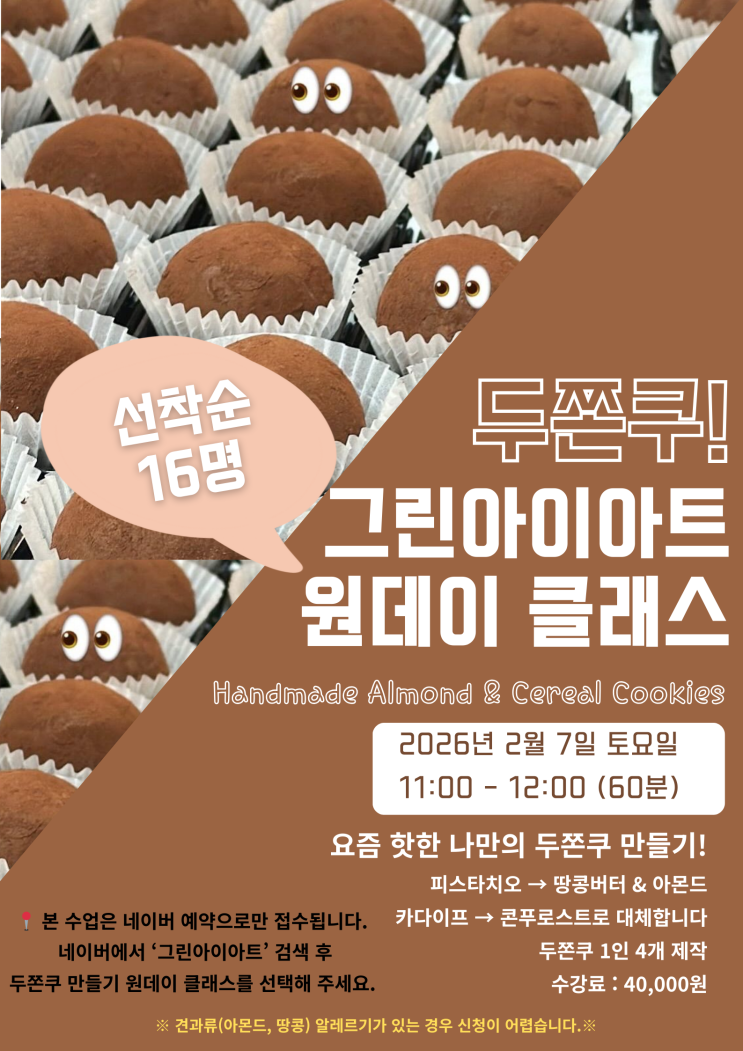 요즘 핫한 두쫀쿠 만들기 원데이 클래스 아이도 어른도 반하는 달콤한 시간, 그린아이아트에서 만나요! 요즘 SNS에서 자주 보이는 두쫀쿠! 쫀득한 식감에 달콤함까지 더해져 아이들 반응이 정말 좋아요. 그래서 준비했어요. 그린아이아트 두쫀쿠 만들기 원데이 클래스 이번 클래스는 아몬드 & 시리얼 쿠키 두 가지 맛으로 진행되고, 아이 한 명당 총 4개의 두쫀쿠를 직접 만들어 가져갈 수 있어요. 클래스 안내 일정 : 2026년 2월 7일 (토) 시간 : 오전 11:00 – 12:00 (60분) 대상 : 19년도이상 아이 부터 정원 : 선착순 16명 수강료 : 40,000원 ⚠️ 꼭 확인해 주세요 견과류(아몬드, 땅콩) 알레르기가 있는 경우 신청이 어....... <img src="https://blogthumb.pstatic.net/MjAyNjAxMjdfMTcz/MDAxNzY5NDk1NjU4MTM5.d76Pdy28VYUbfHFOVbyk1jw76w0s1LaMuYdHfmBalH0g.9oxVvpj7o5NdIwshXm-yduGrjHNuuEKXy4XL_WBD6QUg.PNG/%B5%CE%C2%CB%C4%ED%B8%B8%B5%E9%B1%E2.png?type=s3" />