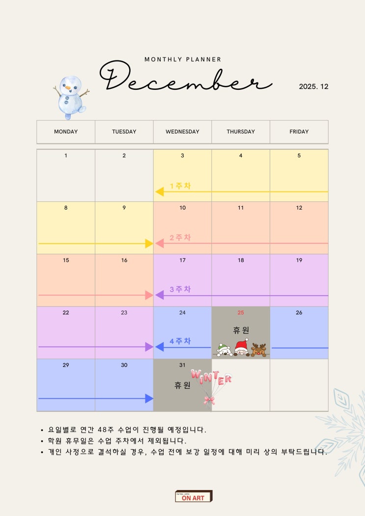 월별 수업 일정 안내 (매월 업데이트) 본 게시글은 오엔아트 월별 수업 일정 안내용 공지글입니다. 수업 운영 일정은 매월 업데이트됩니다. 학원 기본 운영 안내 대상 : 유치부 / 초등 저학년 / 초등 고학년 / 학생취미반 (중, 고등학생 가능) 수업 형태 : 주 1회 정규 수업 수업 시간 및 정원 유치부 : 60분 ( 1: 3) 초등부 : 90분 (1:4) ※ 모든 수업은 소수 정원제로 운영됩니다. 2025년 12월 수업 일정 ✔ 수업기간 12월 3일(수) ~ 12월 30일(화) ✔ 휴원일 크리스마스 : 12월 25일(목) 겨울방학 : 12월 31일(수) ~ 1월 4일(일) ※ 방학 기간에는 정규 수업이 진행되지 않습니다. 수업 시간표 안내는 아래 글에서 확인해주세요. https:/....... <img src="https://blogthumb.pstatic.net/MjAyNTEyMjRfMTAg/MDAxNzY2NTYwNDkxNzQy.jhulqITE-eiWtubjtzEPay4kYndb9fISZCwwt9XTZOEg.Yn17jQpaIgmAzYeNPmv7WCmy72cyDH-S69qiCxKBJLAg.JPEG/1.jpg?type=s3" />