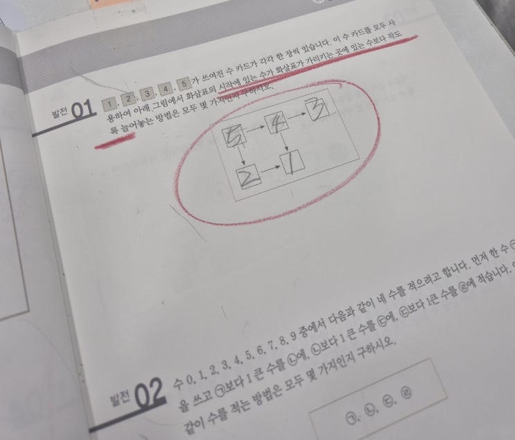 우리 친구가 질문할 문제를 가져왔어요. 문제를 이해하지 못한 상태로는 아무리 설명해도 이해되지 않을 테니(또는 방법만 외워버릴 수 있으니) 문제 이해 정도를 확인합니다. 확인을 위해서 문제 조건에 맞게 예를 들어 한 가지 방법을 완성해 오라고 합니다. 역시... 문제를 이해하지 못했네요. 문제의 조건 중 놓친 부분을 짚어주며 찾아온 한 가지 경우와 문제의 조건이 모두 맞아떨어지는지를 아이에게 물어봅니다. 그럼 아이도 스스로 문제를 잘못 이해했음을 인지하게 되고요. 다시 조건에 맞는 한 가지를 채워 오도록 합니다. 이번엔 조건에 맞게 잘 찾아왔네요. 그런 다음 혹시 1이 꼭 들어가야만 하는 자리가 어디인지 알고 있는지 물....... <img src="https://blogthumb.pstatic.net/MjAyNTEyMjVfMTc4/MDAxNzY2NjUzMjMyODY5.lo-wyX3mwMGrd_8GXIr5fEawnddjHdUH2tdlawNN0LMg.8jeqL837g0GodQDDKnOK8qgiWDnlGEpN9v7mE86fSF0g.JPEG/900%A3%DF1766652011496.jpg?type=s3" />