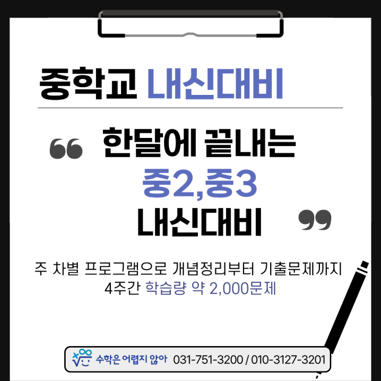 안녕하세요 위례 수학학원 수어안 원장 송명주입니다. 벌써 다음달 말 4월말이면 중학교 2,3학년의 중간고사기간입니다. 현재 중학교 1학년은 자유학기제로 운영되어 1학기는 시험이 없고 2학기도 고등 입시에 성적을 반영하는 학교가 특목고로 제한적입니다. 사실 상 중학교2학년이 내신시험을 처음 맞이하는 때 입니다. 우리 학생들은 아직 시험에 익숙하지 않습니다. 초등학교에서는 아예 시험을 보지 않았고, 새로운 내용을 배우는 공부에 익숙해져 있습니다. 배운 내용의 완성도를 높이고 숙련도를 높여야 하는 시험 공부에 대비 해야 합니다. 그래서 가장 효율적인 내신대비 프로그램을 준비했습니다. 어떻게 학교시험(내신)준비를 해야하....... <img src="https://blogthumb.pstatic.net/MjAyNjAzMjNfMTc1/MDAxNzc0Mjc2MDM5OTUx.AlRtcz4HEsvyLDh2vNIHTQWAvf_AGwujidl6iN5YSGYg.l_YyMVHatnquPEOiiXkr4UlGX5U7Jo9cZPMN02qFCB4g.PNG/1.png?type=s3" />