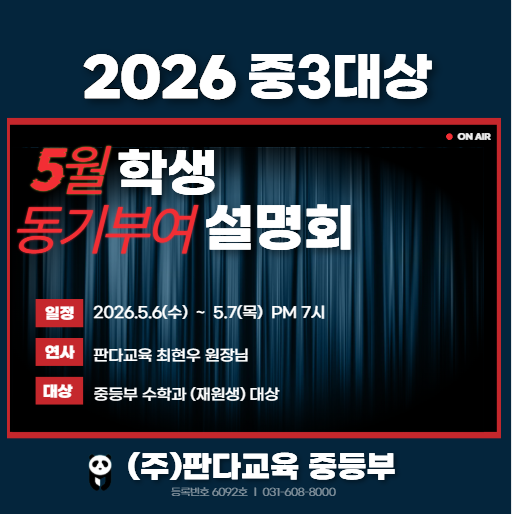 나는 어떤 고등학교에 어울리는 사람일까? - 외고/자사고 vs 일반고 성향 분석 고등학교 선택을 앞두고 막연한 불안감을 가진 아이들에게 각 고교 유형별 특징과 필요한 성향을 구체적으로 보여줌으로써 스스로 목표를 설정하게 만듭니다. 안녕하십니까. 판다교육 중등부 입니다. 꽃피는 5월, 하지만 우리 중3 아이들의 마음속엔 고등학교 진학에 대한 고민과 다가오는 중간고사 ~기말고사 걱정으로 가득할 것입니다. - 지금 내 성적으로 어디를 갈 수 있을까?, - 고등학교 수학은 정말 어렵다는데 어쩌지 ? 막막한 질문들 속에서 아이들이 중심을 잡고 다시 앞으로 나아갈 힘, 그 '진짜 동기'를 판다교육이 만들어 드리겠습니다. [202....... <img src="https://blogthumb.pstatic.net/MjAyNjAzMjdfNDUg/MDAxNzc0NTkyODc3NzA3.nWKSP5hNoWDhZlv78zI2_8AAT4jiW3yW6L7F_qmsWcwg.JEJpGVYUCcfW2F7ZwwqIU6T4YpXf585T-Wt_ggU7sMIg.PNG/image.png?type=s3" />
