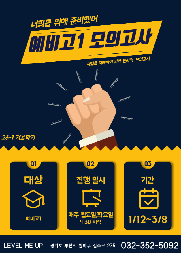 안녕하세요 레벨미업학원입니다 방학기간 동안 매주 1회 고1 모의고사를 진행합니다 고1 주 1회 모의고사 필수 등원입니다 일정 확인하고 꼭 시간지켜 등원할 수 있도록 바랍니다 상담 및 문의 <img src="https://blogthumb.pstatic.net/MjAyNjAxMTNfNjAg/MDAxNzY4Mjk5NDgzMDAz.JVU8TG5xxZw0HESj1n0Rqy3VPxqekiZQV4yO4YPmjF0g.r33o6hBzeR6weP76nOychIP1NIq-SfrHebAN43gzrdog.PNG/image.png?type=s3" />