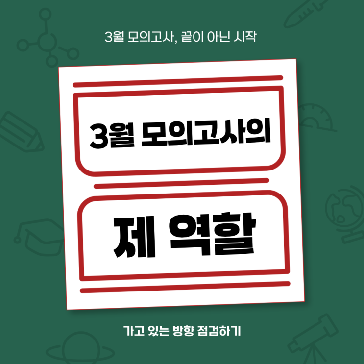 3월 모의고사는 많은 학생에게 첫 시험입니다 특히 고3이라면, "이제 진짜 시작이다"라는 긴장감이 더해집니다 하지만 3월 모의고사는 성적을 증명하는 시험이 아니라 현재 위치를 확인하는 시험에 가깝습니다 이 시험의 가치는 점수 그 자체보다 이후의 대응에 달려 있습니다 1. 3월 모의고사는 '완성도'가 아니라 '출발선'입니다 3월 시험은 아직 실전 감각이 완전히 올라온 상태가 아닙니다 개념이 덜 정리되어 있을 수도 있고, 시간 배분이 안정되지 않았을 수도 있습니다 따라서 이 시험의 점수는 실력을 확정하는 지표라기보다 현재 공부 방식이 어느정도 통하고 있는지를 보여주는 자료입니다 점수 하나에....... <img src="https://blogthumb.pstatic.net/MjAyNjAyMjdfNjUg/MDAxNzcyMTg0MDMwODcz.iaawvy9yL_EmC5BZndhc9qKEB_bXHId3LbpvjK39Basg.1EAW_v4aNWN0mPQ_S_xPwKU2840V4XR-yXvJPFIkxhcg.PNG/%C1%A6%B8%F1%C0%BB_%C0%D4%B7%C2%C7%D8%C1%D6%BC%BC%BF%E4._%284%29.png?type=s3" />