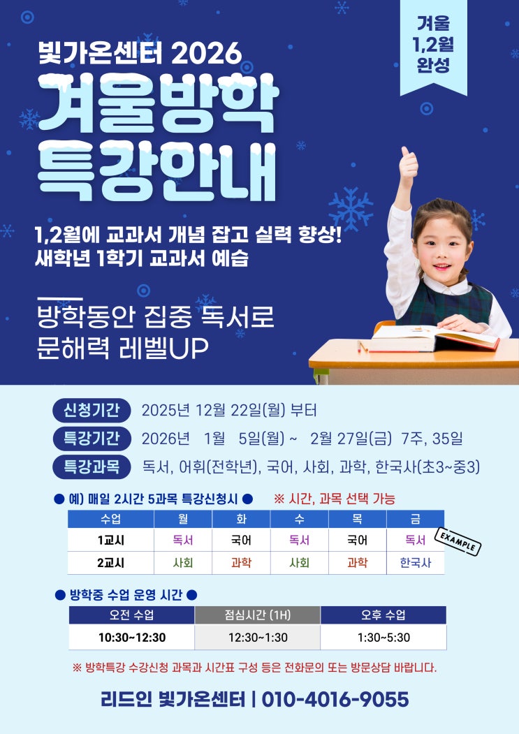 안녕하세요! 리드인 빛가온센터입니다. ☃️ 어느새 2025년도 마무리되어 가고, 아이들의 실력이 쑥쑥 자랄 수 있는 중요한 시기인 겨울방학이 다가오고 있습니다. 이번 겨울방학, 어떻게 보내느냐에 따라 내년 1학기 아이들의 학교생활 자신감이 달라집니다. 수학도, 과학도 결국은 지문을 이해하지 못하면 문제를 제대로 풀 수 없습니다. "학교 성적의 치트키"는 바로 탄탄한 문해력입니다! 빛가온센터에서 준비한 2026 겨울방학 특강으로 독서 습관과 교과 성적, 두 마리 토끼를 모두 잡아보세요! 2026 겨울방학 특강 개요 이번 특강은 새 학년 교과서를 미리 훑어보며 개념을 잡고, 집중 독서를 통해 문해력을 레벨....... <img src="https://blogthumb.pstatic.net/MjAyNTEyMzBfNTkg/MDAxNzY3MTAzMjQ1ODEw.J9NfebEt8EXIHEdp2Axg4oVZnbFcstimmD-IEWTr8MYg.stcS81bDj4NeB6f0COcWDzNSErc9izBQY1VS332KnyAg.JPEG/KakaoTalk_20251220_144830834.jpg?type=s3" />