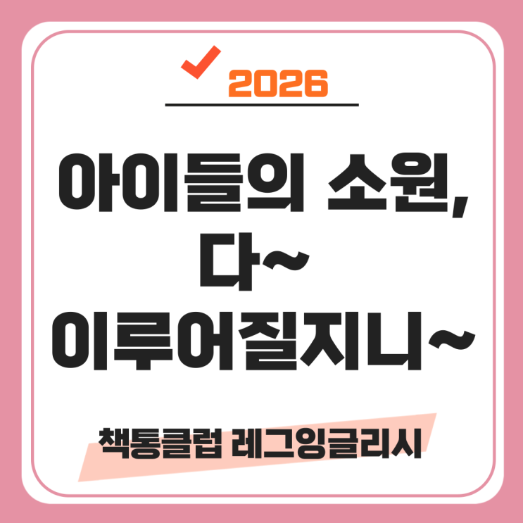 2026 아이들의 소원, 다~ 이루어질지니~ 국어, 영어의 튼튼한 다리 언어 전문가 그룹 (Language Expert Group) 책통클럽 레그잉글리시입니다. 2026, 새해가 밝았습니다. 책통클럽 레그잉글리시에서는 지난 12월 한 달 동안 아이들의 소원을 모았습니다. 수업을 열심히 한 날에 소원권을 하나씩 받아서 마음속에 소원을 적어 크리스마스 트리를 장식했어요. 그리고 새해가 되어 아이들의 소원에 답을 해 주었습니다. 그리하여 선택된 마라탕파티! 치킨파티! 새해에는 이렇게 소원이 이루어지는 한 해가 되었으면 합니다. 조만간 파티 현장소식으로 다시 만나요^^ 상담신청서 터치하면 문자 상담 <img src="https://blogthumb.pstatic.net/MjAyNjAxMDRfMTQ0/MDAxNzY3NTMzMTA5Njc0.y92xgJ0SCga5hiWaYSH6GXFH4lU8CQ90ttDlswtgujQg.AnMWTDvssLELwv50fYM4LoW0vQlkVhoKDgY8_DWQVq4g.PNG/004.png?type=s3" />