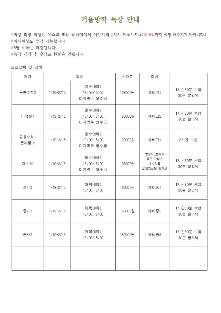2026년 겨울방학 이원수학방학특강