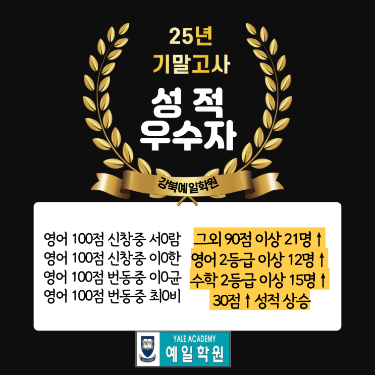 [90점이상 21명+@] 25년 기말고사 모두 고생했어요♥/ 신창중 번동중 수송중 염광중 남대문중 강북구 예일 학원