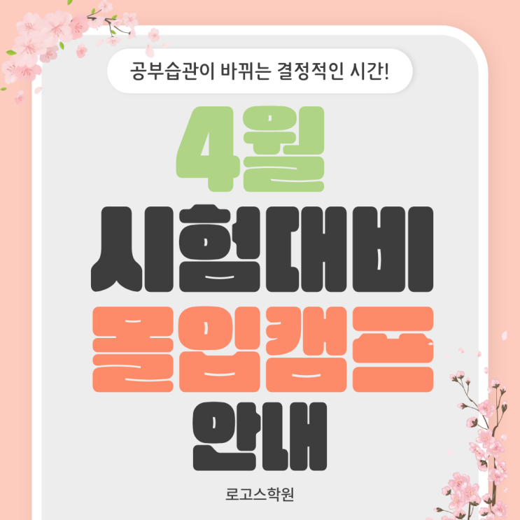 안녕하세요-! 강북 번동 수유역 근처에 위치한 초등, 중등, 고등 영어, 수학 전문학원 로고스학원입니다:) 새학기가 시작되었습니다! 새학기는 학생들의 학습 방향과 공부 습관이 결정되는 매우 중요한 시기입니다. 이 시기를 어떻게 보내느냐에 따라 한 해의 학습 성과가 크게 달라질 수 있습니다. 이에 로고스학원에서는 4월 시험 대비는 물론, 올바른 공부 습관 형성을 돕기 위해 4주간의 주말 몰입 캠프를 진행하고자 합니다. 이번 몰입 캠프를 통해 학생들이 스스로 학습에 집중하는 힘을 기르고, 효과적인 공부 방법을 체득하여 한 단계 더 성장할 수 있는 시간이 될것입니다. 오늘은 4월 시험대비 몰입캠프 진행에 대해서 안내하겠습니다....... <img src="https://blogthumb.pstatic.net/MjAyNjAzMzBfMjA2/MDAxNzc0ODMyODIzMTM4.OC12wid8l6dThV1S6VWXi4FdvG2w_6GSCaO7GOQN1IQg.QhbpOSBn3L3OI929KW1s4N-fifK7QLN80pFpj25om08g.PNG/%C1%A6%B8%F1%C0%BB_%C0%D4%B7%C2%C7%D8%C1%D6%BC%BC%BF%E4._%2859%29.png?type=s3" />