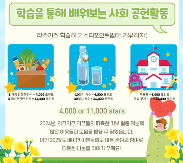 이제는 ‘나눔’까지 이어지는 특별한 경험으로 만들어보세요 ! Raz-Kids에서 진행하는 2026 스타 기부 이벤트가 시작되었습니다! 아이들이 열심히 학습하며 모은 스타포인트로 도움이 필요한 곳에 기부할 수 있는 의미 있는 활동인데요 배움을 통해 자연스럽게 ‘나눔의 가치’까지 배울 수 있는 좋은 기회입니다. 특히 이번 이벤트는 단순 기부에서 끝나는 것이 아니라, ✨ 기부한 만큼 현금으로 돌려받을 수 있는 상금 이벤트까지 함께 진행된다는 점! 아이의 노력과 따뜻한 마음이 더 큰 보상으로 이어질 수 있어 참여 의미가 더욱 특별해요 기간: 2026.03.23 ~ 04.24 학습도 하고, 포인트도 모으고, 그리고 그 포인트로 기부까지....... <img src="https://blogthumb.pstatic.net/MjAyNjAzMzBfMjY2/MDAxNzc0ODQ5MjA1Mzk5.ZVP6jNtnRgLqFiRM3lpWmVAVJCDhsRLRjoGV5IgFQaMg.uyrIghWdKbpZXB1zJ03EqUs76NiNrWxrNufDFG5B3vsg.PNG/2.PNG?type=s3" />