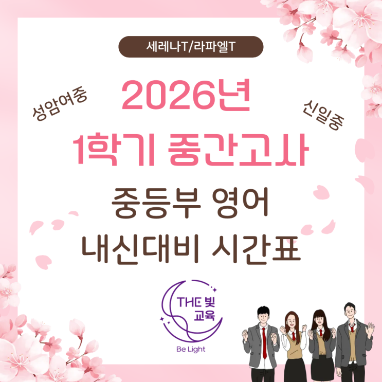#더빛교육세레나학원 #성암여자중학교 #신일중학교 #영어 #내신대비 #시간표 안녕하세요! 중등부 영어 수학내신 대비 전문학원! 더빛교육 세레나학원입니다! 2026년 1학기 중간고사가 약 한달 앞으로 다가왔습니다. 중학생들의 좋은 성적을 위한 영어 내신 대비 시간표 안내드립니다! 성암여자중학교와 신일중학교 2학년 학생들의 영어 내신 대비 시간은 월요일과 수요일 4시 30분부터 7시 30분까지 진행됩니다. 성암여자중학교와 신일중학교 3학년 학생들의 영어 내신 대비 시간은 수요일과 금요일 7시부터 10시까지 진행됩니다. 성암여중과 신일중 영어 내신 대비 수업은 세레나 선생님과 라파엘 선생님께서 담당합니다~ 중학교부터 영어를 꼼....... <img src="https://blogthumb.pstatic.net/MjAyNjAzMzFfMjA2/MDAxNzc0OTUwMDA2NDg5.l8XGcnDt1qMXoQ2BTYRoXpf0OfUppjMIqy_A9jDeBW4g.EblzpkrtIRS8L8ohApGKrTOfmgExgxVPWpMd_O5sjGcg.PNG/1.png?type=s3" />