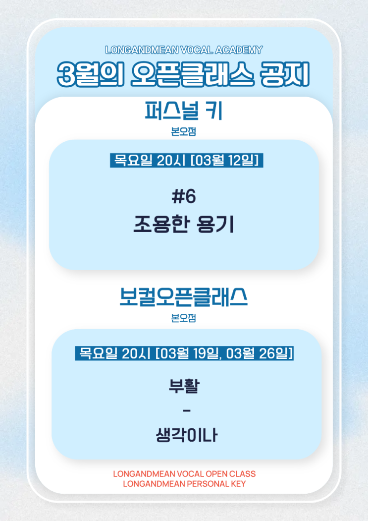 안녕하세요 ‘꿈을 만드는 노래소리’ 안산보컬학원 롱앤민보컬아카데미입니다 :) 겨울이 서서히 물러가고, 공기 속에 봄기운이 스며드는 3월입니다 계절이 바뀌는 시기처럼 우리의 마음도, 목소리도 조금씩 새로운 방향을 향해 움직이는 시간인데요 3월에도 롱앤민에서는 성인 수강생분들을 위한 ✨ 무료 클래스 ✨ 퍼스널 키 & 보컬 오픈클래스를 진행합니다 ❕ 퍼스널 키 (Personal Key) #6 ❕ 일정: 3월 12일 목요일 오후 8시 장소: 본오점 주제 : “조용한 용기” 화이트데이에 마음을 표현하는 데에도 생각보다 많은 용기가 필요하듯, 무대 위에서 새로운 장르에 도전하거나 조금은 자신 없던 노래....... <img src="https://blogthumb.pstatic.net/MjAyNjAyMjVfMTgx/MDAxNzcyMDAwNzUzMTY4.K4znxn04OYv2buP7I8gi5Lo57PID-m5KsZwAzW4Y8fIg.lNQk4pFw6zALJALXg9nRxsZXF5RfEW6S8SDG8sjQpJ0g.PNG/2.png?type=s3" />