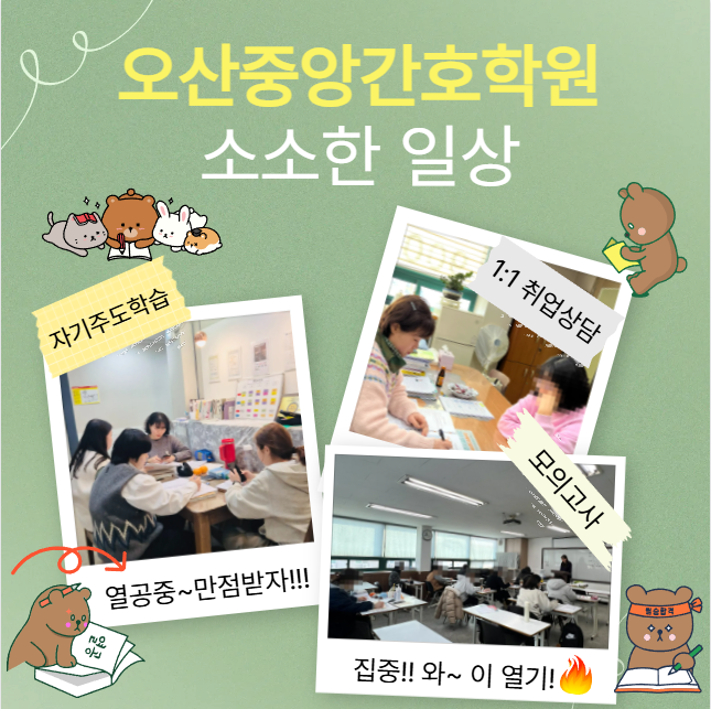 안녕하세요 오산중앙간호학원입니다. 구정 명절을 앞두고 온 동네가 북적북적 하네요~ 모두모두 새해 복 많이 받으세요~♥♥♥♥♥ 오늘 저희 오산중앙간호학원도 명절날 큰집처럼 정말이지 북적북적했습니다.^^ 명절을 앞두고 인사하러 오신 선배님들에.. 주간 수업까지 들으시며 모의고사에 열의를 보이시는 야간 훈련생분들에... 소집일을 맞아 오랜만에 학원에 방문하신 54기 분들까지 와~~너무나 반갑고 오고가는 새해인사에 복이 마구마구 쏟아지는기분이었어요^^ 저희 오산중앙간호학원은 26.2.16(월) ~26.2.20(금) 긴 명절연휴를 보내게 됩니다^^ 모두 한주 잘 먹고 잘 쉬시고 뽀송뽀송한 모습으로 만나요~ 저희 오산중앙간호학원은 26년....... <img src="https://blogthumb.pstatic.net/MjAyNjAyMTNfMTEw/MDAxNzcwOTcyODY2ODM4.EjPfMFq9pOV_KaRmr8imaXEuG3nCJzKub--XlIc7_dog.a8iECC6OyS7ArViHOj4qHC6gDAacpFpjGnSA6A5HLw0g.PNG/image.png?type=s3" />