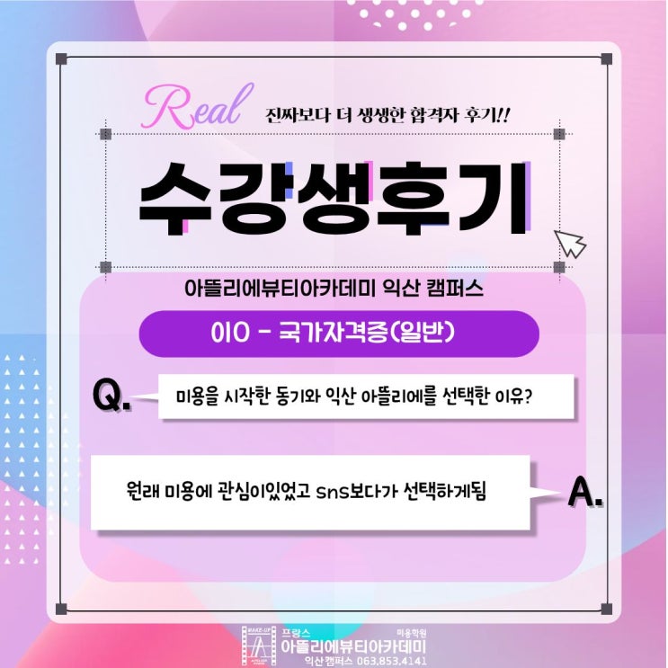안녕하세요 #익산최대규모 #익산미용학원 #익산아뜰리에 미용학원입니다~! 이름 : 이0 수강과목 : 헤어 Q1. 미용을 시작한 동기와 익산아뜰리에를 선택한 이유 A. 원래 미용에 관심이있었고 sns보다가 선택하게됨 Q2. 수강하면서 가장 도움이 되었던 점 A. 선생님이 하나하나 다 열심히 가르쳐주셔서 더 열심히하게됨 Q3. 앞으로의 목표나 계획 A. 미용실 취업 Q4. 미용을 진로로 생각하고 있는 후배들에게 한마디 A. 나도했으니까 무조건 다 합격할듯~~~ 쌤 말 잘듣기ㅋ!!!!! 진솔한 후기를 남겨주셔서 감사해요~! 더욱 더 발전하는 아뜰리에로 보답하겠습니다 ♥ ----------------------------------- 다른 궁금하신 사항은 전화로 문의 주세요....... <img src="https://blogthumb.pstatic.net/MjAyNjAyMjdfMjcx/MDAxNzcyMTU0NjcyNzc3.jV6B3_Z7dOdiPyyk9RgHVbHhXzB3Ga6XxpeZlg7TcZ4g._Jpbn2vSo5OJ7bmaKIga0I6oxIAXE11J-ntDhuVdJfIg.JPEG/1.jpg?type=s3" />