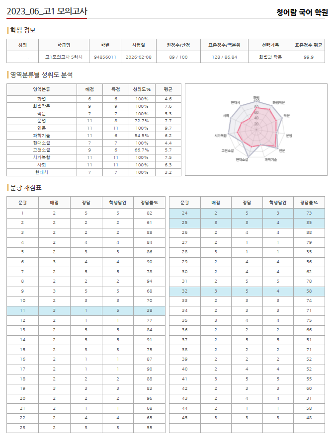 총 7주에 걸쳐, 3월 모의고사 4개년, 6월 모의고사 3개년을 오답해설까지 모두 마무리했습니다. 모든 성적은 서면으로 학생과 학부모님께 전달되고 7주가 마무리되어 선생님의 평가까지 마무리되었습니다. 일요일 아침마다 수업에 참여하느라 고생많았습니다^^ (앞으로 2주 동안 모의고사에 참여하지 못한 학생들, 늦게 수강한 학생들을 대상으로 다시 2개년 모의고사가 진행됩니다.) <img src="https://blogthumb.pstatic.net/MjAyNjAyMjZfMjQ0/MDAxNzcyMTA4NTI1OTI3.qQqmcEC-kkDX1qtRtO6lIyie8KnAOYb-F0DgaBBMGmMg.CRRGDA0tWT_DeZ0mQ7WeKDwpkD0_Ba0x0whwCxyQ8KYg.PNG/5%C2%F7%B8%F0%C0%C7.png?type=s3" />