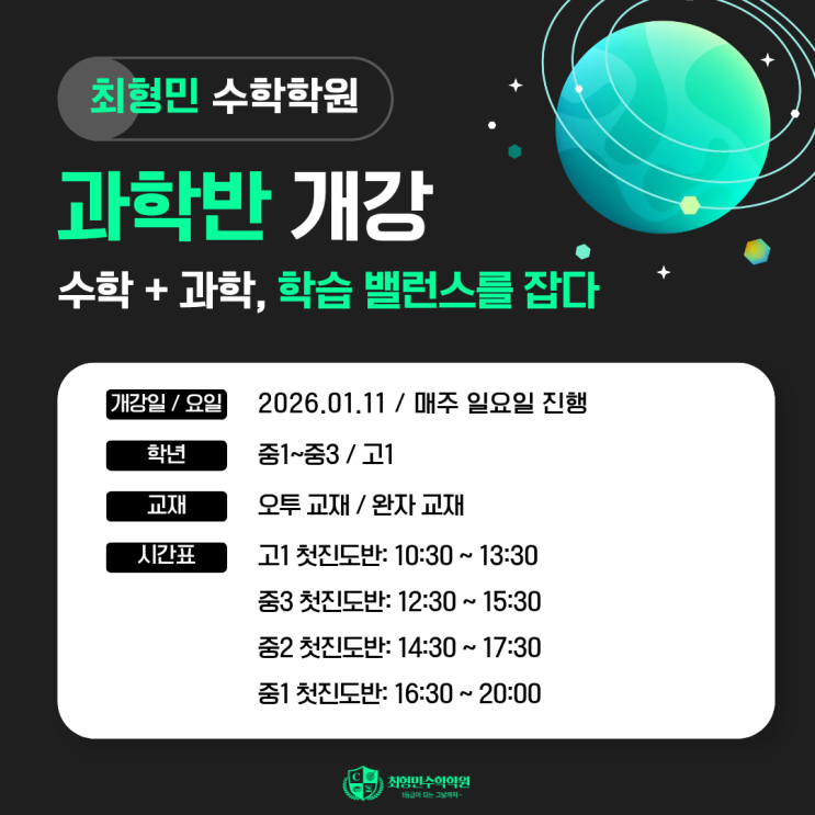[최형민 수학학원] 과학반 개강 - 수학 + 과학, 학습 밸런스를 잡다!