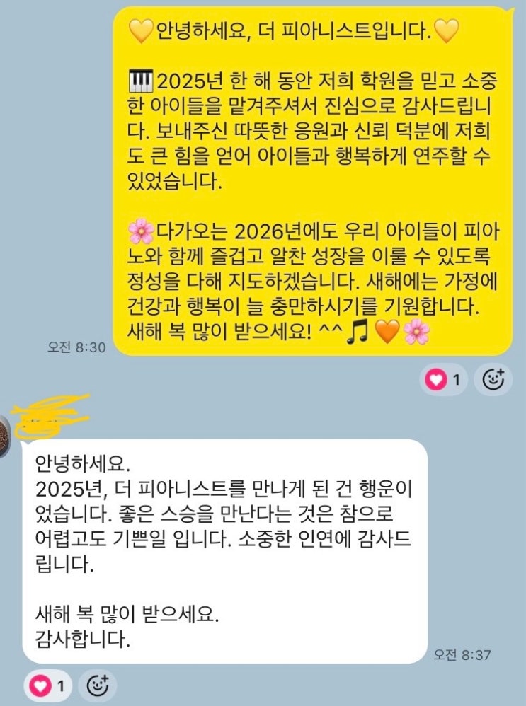 학부모님들께 새해 인사를 드렸는데 이렇게 좋은 말씀 들을 많이 해 주셨어요 . 항상 아이들을 가르치면서 느끼는 건 할 수 있다고 믿어주는 만큼 아이들은 성장한다는 것 입니다 . 처음에 악보 읽기, 연주에 대한 저의 교육 신념들을 주변에 얘기할 때면 특정 아이들만 잘 따라오고 대부분은 어려울 것 이다 라는 말들을 많이 들었는데요 사실 전혀 그렇지가 않았어요. 아이들에게 목표를 심어주고 할 수 있다 응원해주면 보답이라도 하듯 , 자신의 틀을 깨고 성장하는 학생들이 훨씬 더 많았습니다 제가 좋아하는 음악, 피아노로 인해 우리 학생들이 성취감, 자신감, 음악을 진정으로 사랑하는 마음을 가진 다는 것 , 그리고 그 안에서 성장하....... <img src="https://blogthumb.pstatic.net/MjAyNjAxMDZfMjEz/MDAxNzY3NjUzODcyOTkz.p11ffc4-E0M0oiV0vKgMSk8u-LOSfB2A8t-61_lorHsg.klz0-gxCKjip3LB6XJG9ZNjdguexq01fQaFIP84iLFgg.JPEG/IMG%A3%DF0947.jpg?type=s3" />