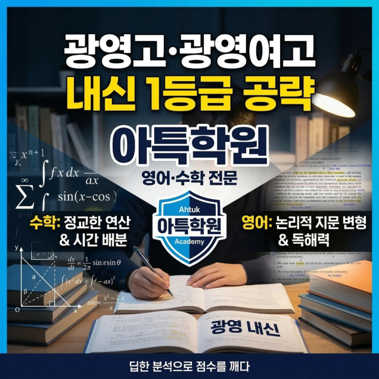 광영고·광영여고 내신 1등급의 설계도를 읽다 열심히 하는데 성적이 제자리라면 공부량이 아니라 전략을 점검해야 합니다. 광영 내신의 정교한 출제 의도를 아특학원이 핵심만 짚어 드립니다. 1. 광영고 수학: 정교한 설계와 시간 싸움 광영고 수학은 단순히 어렵기만 한 게 아닙니다. 학생의 심리와 정확도를 시험합니다. 논리적 변별력. 단순 유형 암기를 넘어 개념의 복합적 결합을 요구합니다. 정교한 연산 능력. 끝까지 답을 도출하는 끈기가 점수를 결정합니다. 아특의 해결책. 실전과 동일한 연산 훈련으로 어떤 상황에서도 흔들리지 않는 힘을 만듭니다. 2. 광영여고 영어: 단순 암기를 넘는 사고력 본문을 다....... <img src="https://blogthumb.pstatic.net/MjAyNjAzMTFfMjQz/MDAxNzczMjE5NTc2MTQ2.zr2y1yKJyD6rb7CWumVk3T1_5HoPo4uiQyBS7MB-kVog.pEMbHKet8o1iADu40BvjMv7tojDdQp0Udov-ShXIoq0g.PNG/%C1%A6%B8%F1%C0%BB_%C0%D4%B7%C2%C7%D8%C1%D6%BC%BC%BF%E4..png?type=s3" />