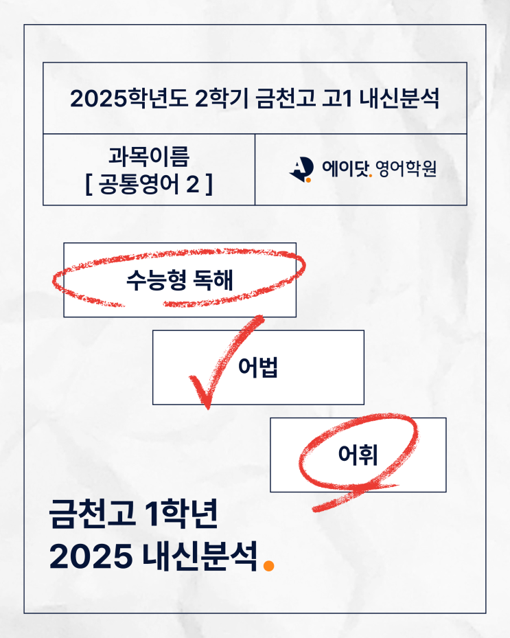 2025년 2학기 기말고사 금천고등학교 영어 내신 분석입니다. 이 시험은 단순 암기를 넘어, 지문 이해의 깊이와 문제 적용 능력을 확인하는 방향으로 출제되었습니다. 교과서와 모의고사 지문을 중심으로 출제되었으며, 기본 지문 숙지 여부를 확인하는 문제와 이를 변형해 사고력을 묻는 문항이 함께 구성되었습니다. 지문을 얼마나 정확하게 이해했는지가 점수의 안정성을 좌우한 시험이었습니다. 객관식 문항에서도 단순 해석을 넘어 지시어, 연결어, 문맥 속 어휘 판단을 요구하는 문제가 포함되었습니다. 특히 빈칸·요약·어법 유형에서 논리적 흐름을 정확히 따라가는 능력이 중요하게 작용했습니다. 비변형 문제로 기본 점수는 확보 가능했....... <img src="https://blogthumb.pstatic.net/MjAyNjAzMDFfMTg3/MDAxNzcyMzU4MDkyMDIy.8OB5HcDR9OnHVuss24FPUT_c8APfYd1c0y7JK4PZhQog._fmSXChm49WnqcXc-aXSEfuz5LfZvE-1RJG5Mh2cx6Yg.PNG/%BF%A1%C0%CC%B4%E5-%B3%BB%BD%C5%BA%D0%BC%AE-%B1%DD%C3%B5%B0%ED-%B0%ED1.png?type=s3" />