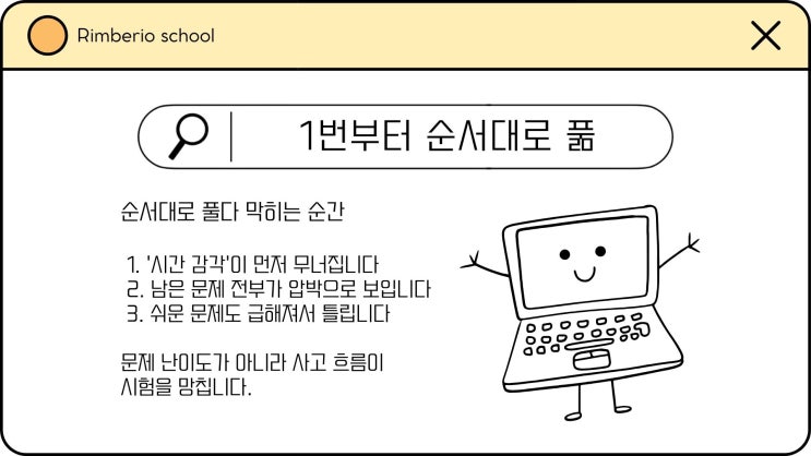 고등 수학 시험이 끝난 뒤 아이들이 가장 많이 하는 말이 있습니다. “앞에서 시간 다 써서 뒤를 못 풀었어요.” “풀 수 있는 문제를 급하게 날렸어요.” 이 말이 나왔다는 건 거의 확정입니다. 문제 풀이 순서를 잘못 잡았습니다. 고등 수학 시험에서 점수를 깎아먹는 가장 큰 원인은 실력 부족보다 잘못된 문제 풀이 순서입니다. 1. 1번부터 순서대로 푸는 것 이건 초등·중등에서나 통하던 방식입니다. 고등 수학에서는 거의 자폭 버튼에 가깝습니다. 왜냐하면, - 고등 시험은 난이도 순서 ≠ 번호 순서 - 초반에 시간 잡아먹는 함정 문제가 섞여 있음 - 2~3점짜리 문제에 5~7분 쓰는 구조 발생 순서대로 풀다 막히면 아이들의 사고는 이렇게....... <img src="https://blogthumb.pstatic.net/MjAyNjAyMTlfNzgg/MDAxNzcxNDk1NDgyOTIx.360u7n7dFJdEYCn1BDYUkddbwh2q5HnjO2_F5gwMuE8g.Uxla40bBrzfHgdMitKJauFbQbK-NBsYN0dj1KWbJMeog.JPEG/2.jpg?type=s3" />