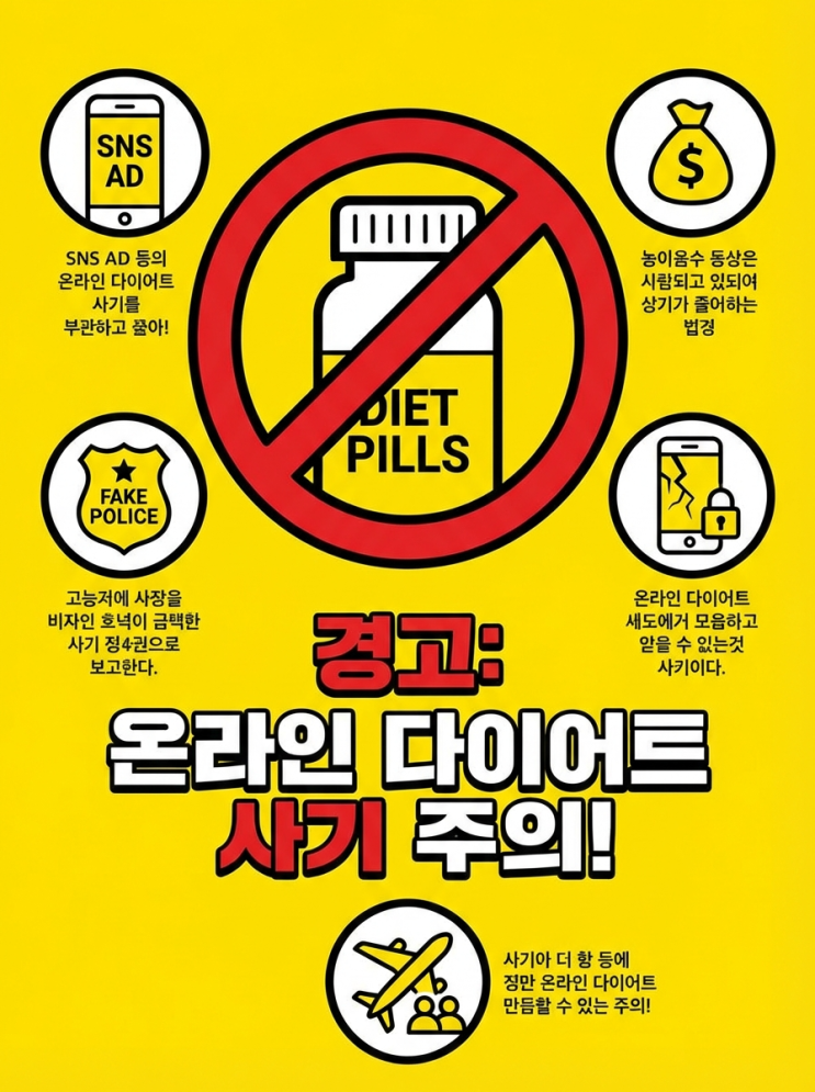 요즘 인스타그램이나 유튜브 보시다 보면 "미국에서 난리 난 다이어트 신약", "살 빼고 인증하면 상금 드립니다" 같은 광고, 한 번쯤 보셨을 겁니다. "설마 내가 당하겠어?" 싶으시죠? 하지만 오늘 소개해 드릴 이 신종 수법은 단순히 돈만 뜯어내는 게 아닙니다. 사람의 심리를 교묘하게 파고들어 마약 사범 누명을 씌우고, 끝내는 인신매매까지 유도하는 정말 악랄한 범죄입니다. 최근 방송(겸손은 힘들다 뉴스공장, 1/22)에서 다뤄진 충격적인 **'다이어트 약 빙자 신종 보이스피싱'**의 전모를 낱낱이 파헤쳐 드립니다. 꼭 읽어보시고 주변에 알려주세요. 1단계: 달콤한 유혹 "살 빼면 4억....... <img src="https://blogthumb.pstatic.net/MjAyNjAxMjJfMTgw/MDAxNzY5MDYwMjUwNjY5.KWZILFrETS78Y1VHnpCFAdnBRZmVfXlzmfao1BXE5Isg.7WT9QUn-2d_5fJCQOVKI3lLwQ-e9gMCJyXIa4aAQ_MQg.PNG/Powerful_warning_poster_style_image_Center_shows_-1769060006093.png?type=s3" />