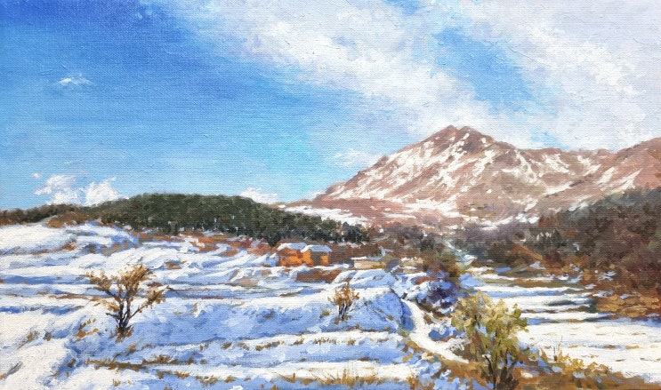 어느 해 3월 말쯤 양평 풍경이었죠. 갑작스럽게 손바닥만 한 눈이 펑펑 내렸습니다. 하지만 금방 녹아버리고 말았답니다. 저 멀리 산꼭대기에만 눈이 살포시 쌓여 있었던 상황 시골 풍경은 메마른 논과 밭이 덩그러니 있던 상태 있는 모습 그대로 담으려니 눈 내린 겨울 풍경과는 거리가 먼듯하여 흰색 물감으로 조금씩 쌓아가 봅니다. 논밭의 경사진 곳들을 반사된 그늘을 푸른 물감으로 영역을 채색하며 눈의 양을 듬뿍 쌓아 갑니다. 하얀 눈의 모습을 표현하기 위해선 푸른색에서 순차적으로 흰색 물감의 양을 더해가며 진행시킵니다. 먼 산 능선과 골짜기에도 눈의 양을 늘려 봅니다. 전체적으로 흰색의 물감을 최대한 활용하여 덧칠하며 쌓....... <img src="https://blogthumb.pstatic.net/MjAyNjAyMjVfMjI4/MDAxNzcyMDI1NDk2ODM1.4YzOltH2-HZiV8cLiHXUMNB559S2aAbJ7Py2AyVGNNYg.8H2vrXi7zFQJx3tGJ2BPLP2QNxf3K96GFcOmWz2mIQEg.JPEG/20260220_173824.jpg?type=s3" />