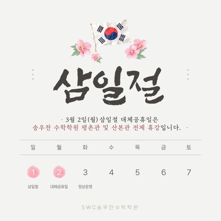 안녕하세요, 평촌수학학원 산본수학학원 송우찬수학학원입니다. 3월 2일(월)은 삼일절 대체공휴일로 삼일절 대체공휴일에 해당하여 평촌관 및 산본관 전체 휴강입니다. 수업은 진행되지 않으니 등원 일정에 착오 없도록 꼭 확인 부탁드립니다. 항상 믿고 보내주셔서 감사합니다. 즐겁고 뜻깊은 연휴 보내세요. 감사합니다. <img src="https://blogthumb.pstatic.net/MjAyNjAyMjZfMjA1/MDAxNzcyMDk2OTAxNzUz.zIdBHFJFVCQpt55OXK-SmKHsdMv5Vb2xN6RRyfjwZsAg.Ke38bdqpw8tWcYChmqaUCuPWKaZEuJVlZBv_PKQZibMg.JPEG/26%B3%E2_%BB%EF%C0%CF%C0%FD_%C8%DE%B0%AD_%BE%C8%B3%BB%B9%AE.jpg?type=s3" />