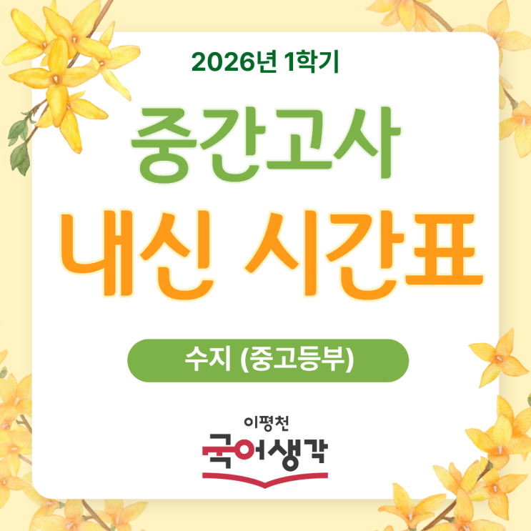2026년 새학년 새학기 입학과 진학을 진심으로 축하합니다! 설레는 맘도 잠시, 곧이어 1학기 1차 지필고사(중간고사)를 준비해야겠죠? 특히 올해는 2022개정 교과서가 중2,고2까지 적용되는 첫해인만큼 새롭게 바뀐 교과서를 바탕으로 내신이 출제될 예정이라 긴강이 더 되는 시험일 겁니다. 이평천국어생각학원은 수능전문학원이면서 학교별 국어 내신도 전문시스템과 콘텐츠로 좋은 성과를 내고 있습니다. 올해는 이제 여러분이 선배들의 영광을 이어가야 하겠죠? ^^ 보통 내신대비 특강은 4주 진행하지만, 내신의 중요도와 기대감 및 걱정을 반영해서 이번 첫 중간고사 대비는 5주 동안 진행한다고 하니 많이 참여해 보셔요~^^ 수업 문의 : 03....... <img src="https://blogthumb.pstatic.net/MjAyNjAyMjRfMjAy/MDAxNzcxOTIxNzI3MDU2.Tlbf8CyUNdgxGTx8krazetTgQQoC8tzFnQkmlhGMUm4g.OodAb3xl4i6bosmxiytmBjP1xpdGmC5MKB3cp3YI47og.PNG/2026%B3%E2_1%C7%D0%B1%E2_%C1%DF%B0%A3%B0%ED%BB%E7_%B3%BB%BD%C5%BD%C3%B0%A3%C7%A5%28%BC%F6%C1%F6%29.png?type=s3" />