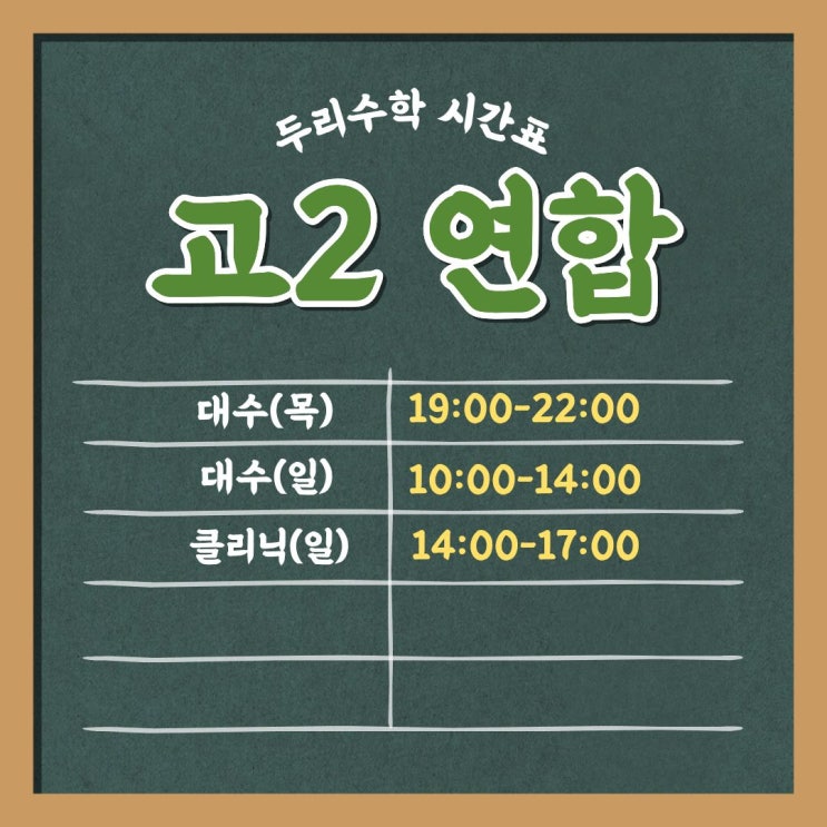 두리수학 2026년 1학기 개강 안내 안녕하세요, 두리수학입니다. 겨울방학 특강이 마무리가 되가는 시점입니다. 개강을 위해서 교재작업을 하느라 정신이 없지만 설레이네요! 2026년 1학기 정규 수업이 드디어! 새롭게 시작됩니다. 방학기간동안엔 진도를 나가면서 넓은 시야를 갖는데 조금 더 무게를 두었다면, 내신기간에는 학교 내신 완성 + 실전 문제 해결력 강화에 집중을 할 예정입니다. 개강 일정 ▶ 개강일: 3월 7일 (토) ▶ 운영반 : 고1 연합반, 고2 연합반, 운정고1반, 운정고2반, 고3 정시대비반, 확률과통계반 ▶ 수업방식 : 판서수업반, 개별진도반 공통수학1 기초반 화, 목 17:30-19:00 고1 #연합반 : (화) 19:00-22:00 / (토) 14:....... <img src="https://blogthumb.pstatic.net/MjAyNjAyMjJfMTYz/MDAxNzcxNzY2NjQ5NTAz.39fgt1mWIt1-ItUgLFssf91P6LP-S4MnFttJAaRLwNUg.Zod548_y3nAGdMTBqeT-JtFrd2peMMM88eS9souNxPog.JPEG/9.jpg?type=s3" />