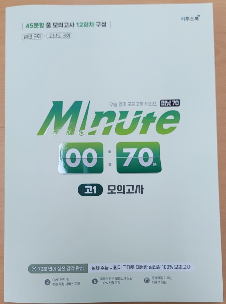 [본 후기는 이투스북으로부터 지원받아 작성한 후기입니다] 오늘은 오랜만에 새로운 교재를 가지고 왔어요. 바로 이투스 북에서 나온 실전대비 모의고사 연습을 할 수 있는 'minute 70 고1 모의고사'에요. 책 제목대로 영어모의고사 70분동안 듣기 17문제, 독해 28문제가 실제 모의고사 시험지와 비슷한 재질과 크기 및 디자인으로 구성되어 있어 실전 감각을 익히기에 좋아요. 총12회차가 들어있는데, 10~12회차는 고난도 문항으로 구성되어 있어 수준별로 연습하기에도 좋아요. 게다가 기출 지문이 아니라 완전 새로운 지문들로 구성되어 있어 실제 학생들의 수준을 더 객관적으로 학인하여 부족한 부분을 보완할 수 있어요. 지문 내....... <img src="https://blogthumb.pstatic.net/MjAyNjAyMDVfNjMg/MDAxNzcwMjk2OTc4OTA5.dhV1aRHvLNQTeCorqimshwFMFesU8OEBROPnIRKxC_Qg.EbVcH3F9LigcQpWhkAlrDvtk1kB5Clm0HA6gOOrzrDwg.JPEG/KakaoTalk_20260127_223046865.jpg?type=s3" />