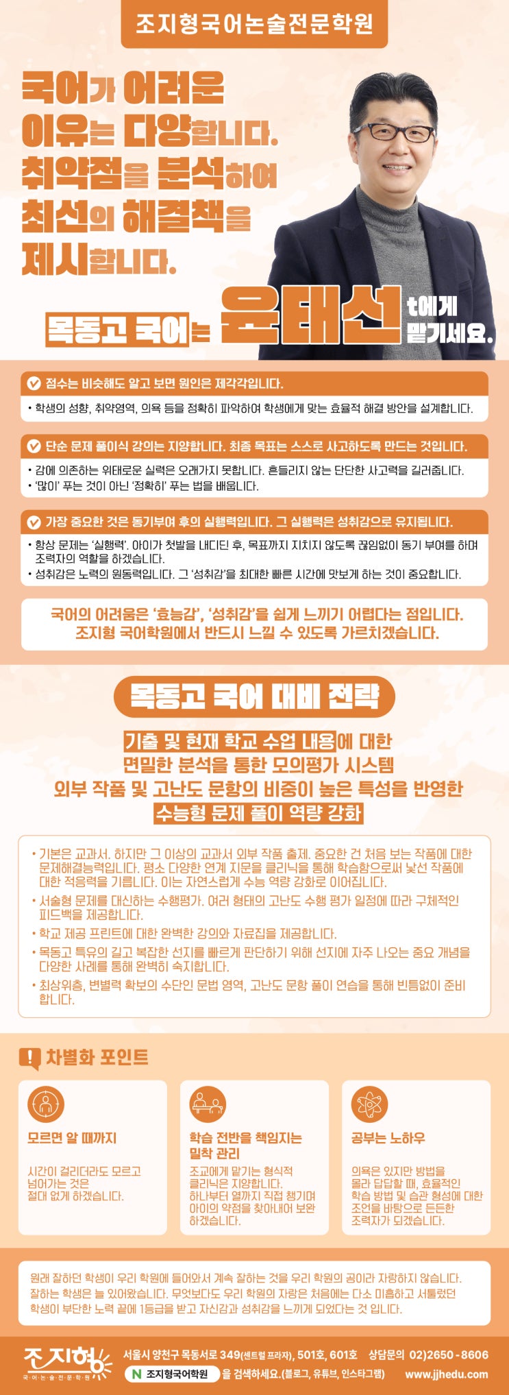 결코 쉽지 않는 목동고 국어내신, 윤태선T와 함께 걱정을 해결하시기 바랍니다. 결과는 물론이고 과정까지 즐거운 내신대비를 하겠습니다. 다년간의 목동고 내신대비 경험에서 우러나오는 가장 효율적이고 최적화 된 목동고 내신대비를 경험하십시오. 목동고 내신대비와 관련하여 궁금하신 점이 있으시면 문의 주시기 바랍니다. 02-2650-8606 <img src="https://blogthumb.pstatic.net/MjAyNjAyMjJfMjI5/MDAxNzcxNzQ0OTIyMDc5._dN-C1N5XirGUxpISIcWuYGYIFLRHpnqyDKfteON8pUg.rlQuE6anT53G2iyGakqt3rZ00eptmqN6opjWm67DSFIg.JPEG/%C0%B1%C5%C2%BC%B1_%BA%ED%B7%CE%B1%D7%BF%EB_%B8%F1%B5%BF.jpg?type=s3" />