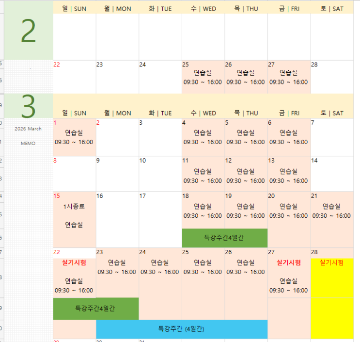 연습실 이용 안내 신청 현황 및 학원 일정에 따라 연습실 일정은 변경 또는 취소될 수 있습니다. ※ 일정 변경 시 개별 안내드립니다. ⏰ 이용 시간 AM 09:30 – PM 16:00 ✔ 입실 및 뒷정리 포함 시간입니다. ✔ 퇴실 시간은 반드시 지켜주시기 바랍니다. 연습실 신청 방법 블로그 비밀댓글로 이름 / 신청 날짜 기재해주세요. 예) 홍길동(월화오전반) / 3월 5일 신청 확인 후 접수 안내드립니다. ✔ 이용 희망 전 주에 미리 신청해주세요. ✔ 신청은 선착순 마감입니다. ※ 연습실 개방일은 학원 일정, 특강, 신청 인원에 따라 변동될 수 있습니다. ※ 신청 완료 시 비밀댓글로 확정 안내드립니다. - 연습실 이용 시 유의사항 - ✔ 연습실....... <img src="https://blogthumb.pstatic.net/MjAyNjAyMjRfMjA2/MDAxNzcxOTE0NDE0OTEx.9C3Z-QO8q6A8XDD58H9QKhNIxqu_WBRGo5bLzHdMyLQg.Fq5vx-cTvXcgYMVqdfrpJNe8zJ6zlcsqzDRkfQRw3Bog.PNG/image.png?type=s3" />