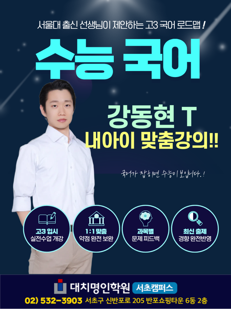 안녕하세요, 대치명인학원 서초캠퍼스입니다. 고3에게 봄학기는 단순히 학기가 시작되는 시기가 아닙니다. 현재의 등급을 깨고 상위권으로 도약할 수 있는 마지막 기회입니다. 서초명인학원이 '정체된 등급'을 '확실한 결과'로 바꾸는 등급 업 솔루션을 제안합니다. 01. [수능 국어] 강동현T : 사고의 틀을 깨는 등급 업 "읽는 법만 바꿔도 앞자리가 바뀝니다." 똑같이 읽어도 점수가 제자리라면 사고 과정에 문제가 있는 것입니다. 서울대 출신 강동현 선생님이 학생의 잘못된 독해 습관을 직접 교정하여 등급을 끌어올립니다. 등급 업 포인트: 1:1 사고 과정 교정: 학생이 지문을 읽는 방식을 옆에서 지켜보고 실....... <img src="https://blogthumb.pstatic.net/MjAyNjAyMjJfMzcg/MDAxNzcxNzQ2MDM2OTI3.t-E29nxbMDPM3dCIuThZgBIONyFLJgP1thUn7SbHBVwg.6-b5o0tSQie1qWC0agUujJXHnt2rB-bt46cjsevD7FIg.PNG/1-%B0%ED2_%BC%F6%B4%C9%B1%B9%BE%EE_%B0%AD%B5%BF%C7%F6t.png?type=s3" />