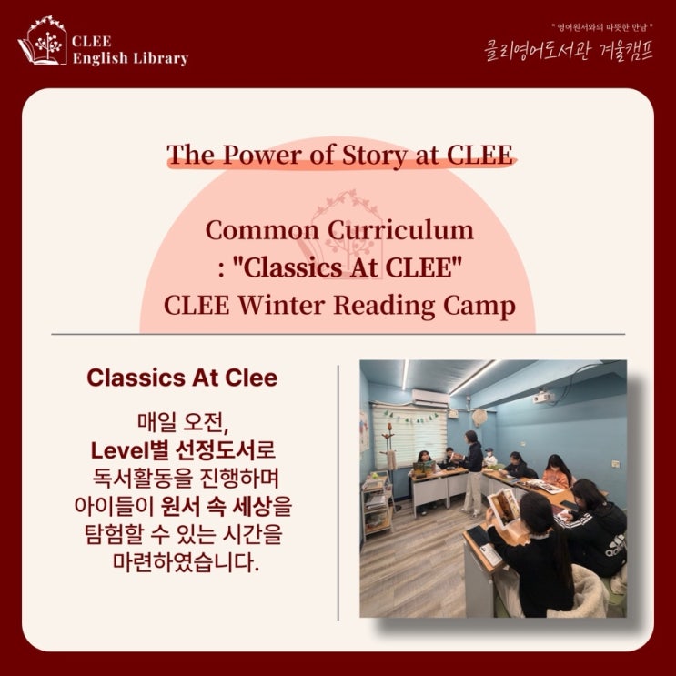 안녕하세요 클리영어도서관입니다:) 올해 저희 영어학원에서 진행한 겨울 캠프 활동에 대해 소개하고자 글을 작성하게 되었습니다. 2026 겨울캠프에서는 테마인 “Sapere Aude” 에 맞춰서 아이들과 영어 원서 속 미지의 세계를 탐구하였습니다. “Classics At Clee”는 매일 캠프 오전, 학원 선생님들이 신중하게 선정한 레벨별 영어 원서를 자유롭게 읽고, 그 내용을 바탕으로 영어로 대화를 나누는 활동입니다. 영문학에서 말하는 “고전(Classics)”은 단순히 오래된 책이 아니라, 긴 시간 동안 가치와 영향력을 지니며 사고의 폭을 넓혀준 작품들입니다. 올겨울, 저희 학원에서는 초등학생 눈높이에 맞춘 영어 고전 동화를 함께 읽고 나누는....... <img src="https://blogthumb.pstatic.net/MjAyNjAxMjZfMTkg/MDAxNzY5NDA2MzU4NDYz.qveip3-dT-D1rhJBD7Ru_FglBKw1IFzwZAvNn7BlQiAg.h8trEgN_CaBwX6SnaDzo0GE7TxVWTLA2yXXCpnS5rX4g.JPEG/IMG%A3%DF1678.JPG?type=s3" />