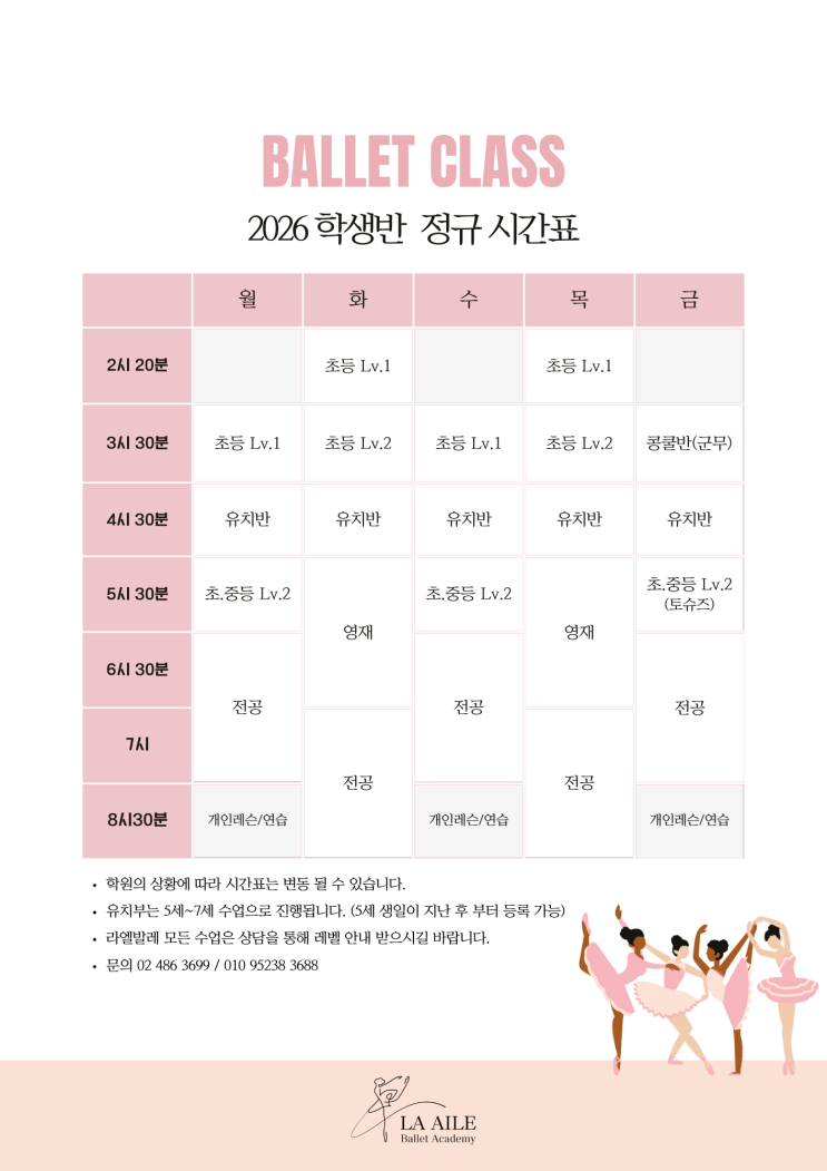 안녕하세요. 라엘발레학원 입니다 이제 곧 새학기가 되면서 새로운 시간표를 안내드립니다. #강동구발레학원 #성내동발레학원 #풍납동발레학원 #둔촌동발레학원 유치발레 , 초등발레 셔틀/차량운행 가능합니다. 차량운행 주요 유치원(어린이집) : 준현유치원 유정유치원 예일어린이집 서울아산병원 제2어린이집 우일유치원 동화나라유치원 성내삼어린이집 참사랑어린이집 풍납어린이집 차량운행 주요 초등학교 : 성일초 성내초 풍납초 토성초 ※ (성내동, 풍납동)그 외 유치원(어린이집) 초등학교는 학원으로 문의주세요 : ) 유치,초등 3개월 등록 시 5%할인 상담예약 상담은 예약제 입니다. 카카오톡채널 ‘라엘발레학원’ 문의 010....... <img src="https://blogthumb.pstatic.net/MjAyNjAyMDRfMjI1/MDAxNzcwMTkzMjc1NjI2.panedkUwVwSOxXoEdmfAYgvcdeDaIEyuJTc1OKWgtUIg.gwLubu4HpBBvgMeye5fjjOdPdEqkMyUUR_S1C9PRQ68g.PNG/26%B3%E2_%C1%A4%B1%D4%BD%C3%B0%A3%C7%A5.png?type=s3" />