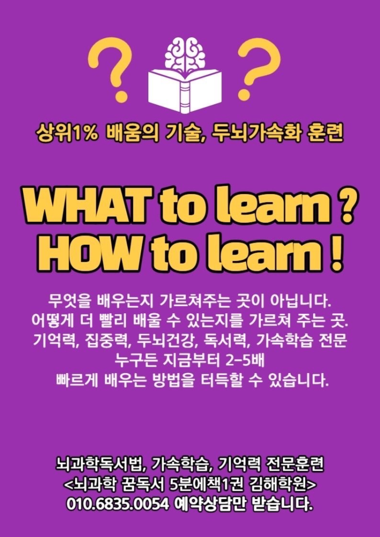 너무 잘하지만 날개를 달아주고 싶은 아이. 너무 잘하지만 1% 뭔가 부족하다고 느낄 때. 점검하고 도와줄 것은 '스스로 공부하는 시간대비, 학습효율'을 탁월하게 높이는 것입니다. 1시간을 공부해도 2시간 공부한 것 만큼 집중하고 글을 읽어낸다면? 100개의 영어단어를 5분만에 외울만큼 기억력이 더욱 빨라진다면? '스스로 공부하는 시간대비,학습 효율'이 높아집니다. <뇌과학꿈독서 5분에책1권 김해학원>에서 상위권 학생을 -> 최상위권으로 1:1 맞춤 커리큘럼을 통해 바르고 빠르게 탁월한 학습능력을 키웁니다. '집중력,읽기능력,문해력'의 탁월한 성장으로 아이에게 자신감 넘치는 날개를 달아주....... <img src="https://blogthumb.pstatic.net/MjAyNjAyMjNfMjgy/MDAxNzcxODUwMjAzNDIw.roi_fOfvJdJtuRojYPSJEJUsufJwuQRQOPQqxTlND20g.FtrXZpNSOYF2oQEDVK-WhIR5cJQeAzwlxa_NB6xpcN4g.PNG/image.png?type=s3" />