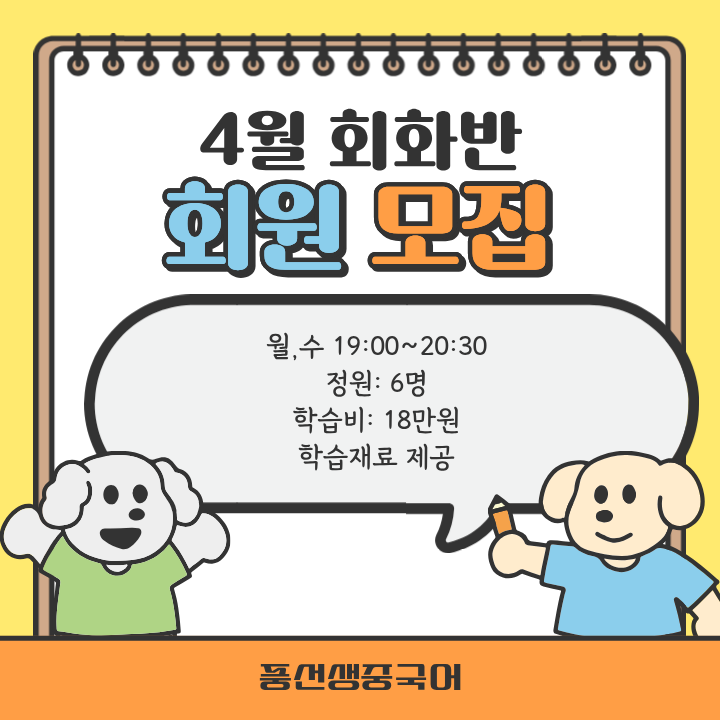 아나녕하세요~ 김해중국어 풍선생중국어입니다^^~~ 여러분, 중국어 문법은 알지만 실제 회화는 어려우신가요? 이런분들을 위한 김해중국어 풍선생중국어는 4월 회화 집중반을 개강할 예정입니다 모집 대상: HSK4급 약 1200개 단어 이상 습득하신분 강사: 김해중국어 풍선생중국어 원어민 원장 직접 강의 중국인 원어민 원장의 회화 수업의 특별점: 완벽한 발음의 롤모델: 중국 정식 교원자격증과 표준어 자격증을 보유한 원장님의 직접 가르칩니다. 가장 정확한 발음을 배울 수 있습니다. 한국 착습자을 가장 잘 이해하는 강사: 한국 대학원에서 교육학 전공 석사 졸업한 중국인 원장의 장점은 한국인 학습자가 중국어를 어려워하는 부분을 정확....... <img src="https://blogthumb.pstatic.net/MjAyNjAyMjNfMzMg/MDAxNzcxODQwMDUwNjI2.MxOHL4RZKyfHvzW4l2ymtu2faBfYN6rSivdVi81diSog.NEDUSqQssqthzNBCHu0CvYGl9R-LkTffntQJcqsVIHgg.PNG/%C1%A6%B8%F1%C0%BB_%C0%D4%B7%C2%C7%D8%C1%D6%BC%BC%BF%E4._%2812%29.png?type=s3" />