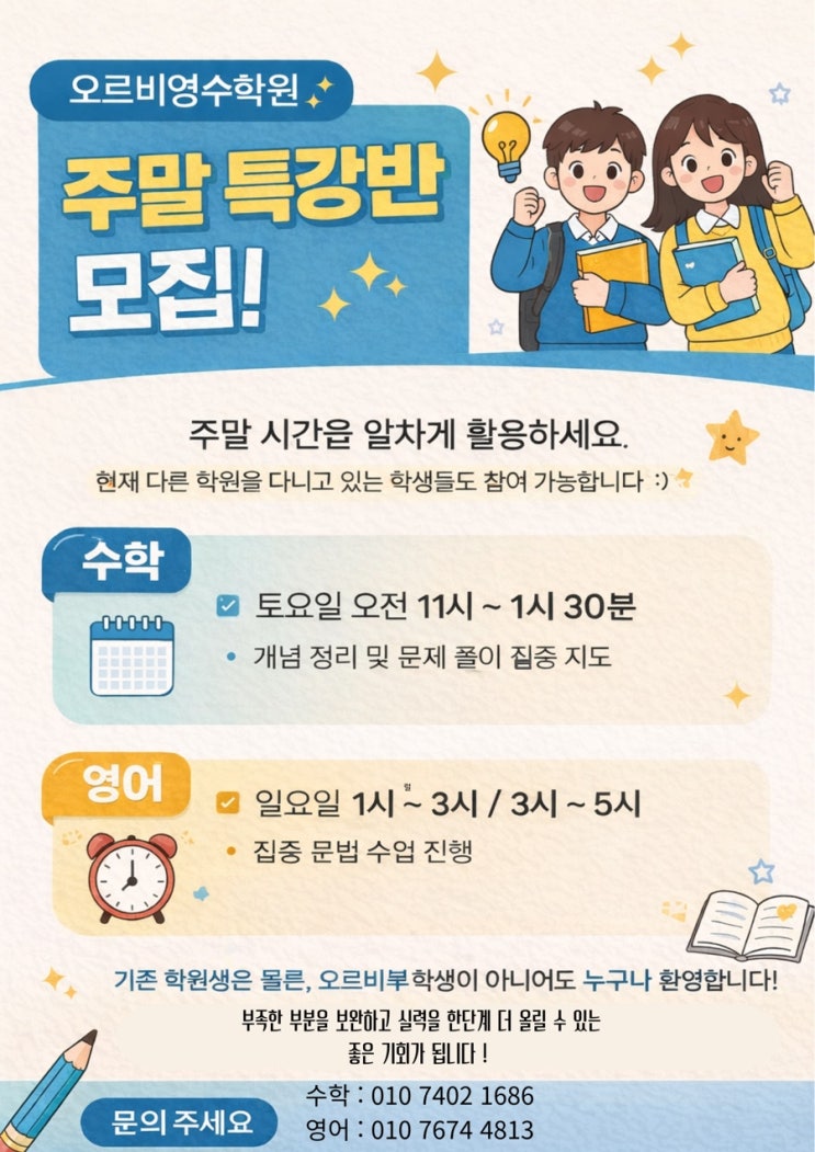 안녕하세요. 오르비영수학원입니다 ! 주말 시간을 알차게 활용하고 싶은 학생들을 위해 주말 특강반을 모집합니다. 평일에는 학교와 학원 일정으로 시간이 부족한 경우가 많습니다. 그래서 부족한 부분을 보완하고 학습량을 조금 더 늘릴 수 있도록 주말 수업을 준비했습니다. 수학 수업은 토요일 오전 11시부터 오후 1시 30분까지 진행되며, 개념 정리와 문제 풀이를 통해 학생들이 헷갈렸던 부분을 다시 한번 확실하게 잡을 수 있도록 지도합니다. 영어 수업은 일요일 오후 1시 ~ 3시, 3시 ~ 5시 두 타임으로 진행되어 학생들의 일정에 맞게 선택하여 수강할 수 있고, 부족했던 혹은 모르는 문법에 관해 편하게 다가갈 수 있는 시간이 됩니다. ....... <img src="https://blogthumb.pstatic.net/MjAyNjAzMDVfMTUz/MDAxNzcyNzE5OTY3MTgy.TOKHWHf6UKqPCLfF_DCrIIdAZJcNxTAcIO2tGH0GFgwg.IBrHf4ejLIGqf4T9VIrzt71SO8f436RriKAVeAR5lx4g.JPEG/%A4%B2.jpg?type=s3" />