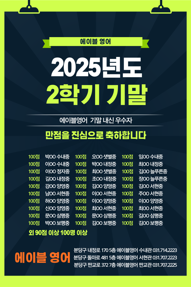 2025년을 마무리 하며 응시한 2학기 기말고사에서 우리 에이블 학생들이 좋은 결과를 얻었습니다. 힘든 과정에서도 열심히 해준 학생들에게 감사함을 표합니다. 에이블영어는 앞으로도 우리 학생들의 실력 향상을 위해 최선의 노력을 다 하겠습니다. <img src="https://blogthumb.pstatic.net/MjAyNjAxMTBfNzEg/MDAxNzY4MDE2NzM5MDU2.pg6PAqb0x5v2LRw3RDvJ-rL1BrI1MCqk9OVeH5F5Sycg.sscYoELaN0HxeLHqrqEjcYSz9pPWlMh5c-O055zsVecg.PNG/%C1%A6%B8%F1%C0%BB-%C0%D4%B7%C2%C7%D8%C1%D6%BC%BC%BF%E4_-001_%2828%29.png?type=s3" />