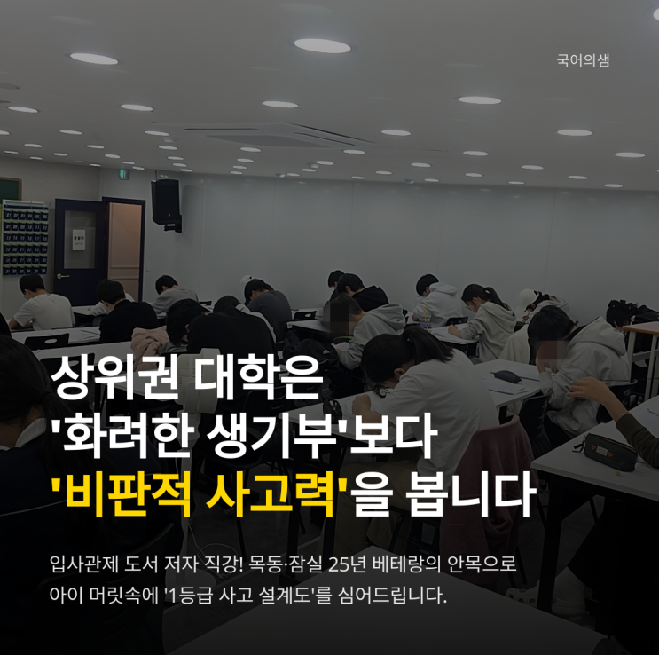 화려한 생기부보다 중요한 '비판적 사고력'의 실체 안녕하세요. 수지국어학원 국어의샘 김연진원장입니다. 좋다는 교재와 대치동 팀 수업까지 챙겨보지만, 정작 모의고사 성적표는 늘 4등급 근처에서 멈춰 있지는 않으신가요? 많은 분이 화려한 생기부에 집중할 때, 상위권 대학은 정보를 논리적으로 재구성하는 비판적 사고의 깊이를 눈여겨봅니다. 목동·잠실이 인정한 강의력 입사관제 저자의 안목을 더하다 저는 국어교육과 졸업 후 정교사 자격증을 취득하고, 목동과 잠실 등 주요 학군지에서 25년 넘게 특목고 대상 전국구 단과 강사로 활동해 왔습니다. 입학사정관제 관련 도서를 직접 집필하며 대학의 평가 기준을 분석하고 그....... <img src="https://blogthumb.pstatic.net/MjAyNjAyMjZfMTI4/MDAxNzcyMDkyODQwMjg5.w6DLt4rz8i8Hh8KcETmnWlXEIdSqufIuSe0RElkW98sg.i-3r-XJplNDpwh22CVoa2WvZMAQoY-o3dSpWxe9F7ywg.PNG/1.png?type=s3" />