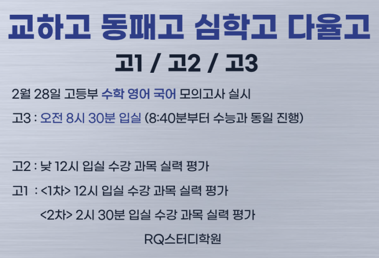 안녕하세요:) RQ스터디학원입니다. 지난 두 달 동안 고등부 수학 영어 국어 특강을 진행해 왔어요. 수학은 내신 대비 문제 풀이 특강이었으며, 영어도 높은 난도의 문제에 잘 대응할 수 있는 유형 파악 특강이었습니다. 국어는 수능 문제와 문법 특강으로 겨울 방학을 달려 왔어요. 이제 1학기 개학을 앞둔 시점이어서 고등부 고3 수능 모의고사와 함께 고1, 고2 실력을 평가하고 점검하는 실력 평가 시험을 준비하여 치를 계획입니다. 2월 28일 토요일에 치를 예정이며, 고3은 오전 8시 30분까지 입실하여 수능과 동일한 상황 속에서 진행됩니다. 매년 한 달에 1, 2회씩 고3 학생들의 실력 강화와 수능 대비를 통해 고3 내신 성적까지 완벽하게....... <img src="https://blogthumb.pstatic.net/MjAyNjAyMjRfODkg/MDAxNzcxOTE0MDU5MTAz.uhq-LFfpYoMOIyYMqYCEpIABwTzhPMBzY0k_-oWX-9wg.JwiGuKGDINHoLBVhsLpdRJgiv0uqBU47Itk8Nm-W9wUg.PNG/%B8%F0%C0%C7%B0%ED%BB%E7_%BE%C8%B3%BB_.png?type=s3" />