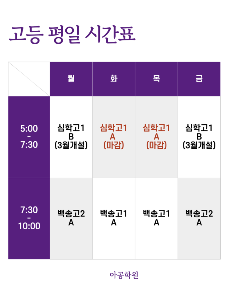 안녕하세요, 아공학원입니다 고등 영어 시간표입니다 심학고1 반은 현재 마감되었습니다 3월에 심학고1 월.금 반이 개설됩니다 내신준비가 시작 되었습니다 고등 내신 준비, 아공과 함께 하세요^^. #아공학원 #운정학원 #파주운정학원 #운정영어학원 #파주영어학원 #운정중등영어 #운정고등영어 #운정초등영어 #심학고영어 #심학고내신 #운정내신영어 #중등영어내신 #고등영어내신 #영어내신대비 #교과서분석수업 #영어기출문제 #내신영어전문 #운정영어수업 #파주영어수업 #운정중학생영어 #운정고등학생영어 #모의고사대비 #독해훈련 #혼공지문훈련 #학교별내신대비 #운정학원추천 #파주학원추천 #운정중고등학원 #아공학원영어 #운정공부 <img src="https://blogthumb.pstatic.net/MjAyNjAyMjRfMjIx/MDAxNzcxOTI2NjU1NzMy.Q7DVLJOevHVSFOwKy4chD79_L0TpbH18jier5BGKEuEg.AwtrMTH78-ODqIPHqUjuyYX-SpUo-KvpLyh0SBUdBKUg.PNG/%C1%A6%B8%F1%C0%BB%A3%AD%C0%D4%B7%C2%C7%D8%C1%D6%BC%BC%BF%E4%A3%DF%A3%AD001%A3%A85%A3%A9.png?type=s3" />