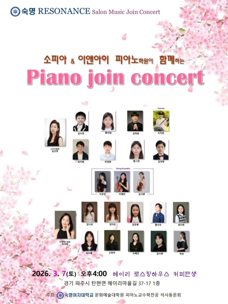 3월7일 4시 헤이리 로스팅 하우스 커피탄생에서 이앤아이음악학원과 소피아음악학원이 함께하는 조인 콘서트에 초대합니다~^^ <img src="https://blogthumb.pstatic.net/MjAyNjAyMjVfMTgx/MDAxNzcxOTQ2NjA3MzMy.OnqEjKHET3YvSr70CXNHVYrtDlK1fLNQ8rY9JPddA5sg.0MBKAWlOPQve2G9pfw4enEIWp71_uYyHqAAiZOGknHsg.JPEG/900%A3%DFScreenshot%A3%DF20260201%A3%DF190010%A3%DFDrive.jpg?type=s3" />