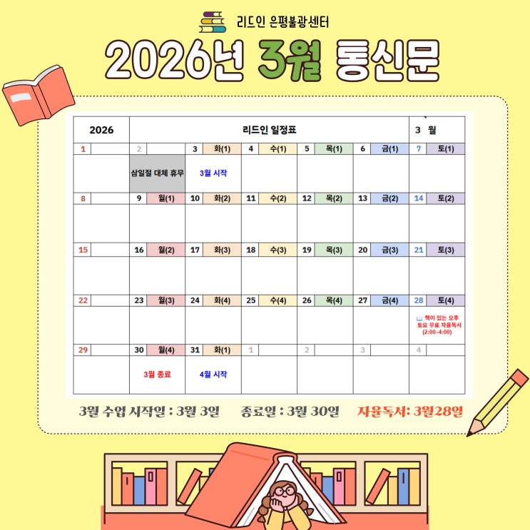 2026년 3월 리드인 은평불광센터 소식 안녕하세요! 독바위역에 위치한 문해력 전문학원 리드인 독서논술 은평불광센터입니다. 신학기를 앞두고 학생들도 개학 준비로 바쁜 시간을 보내고 있습니다. 새로운 학기를 맞아 아이들이 책과 함께 성장할 수 있도록 3월에도 정성을 다해 지도하겠습니다. 토요 무료 자율 독서 안내 리드인 은평불광센터에서는 2026년 1월 부터 매월 마지막 주 토요일 무료 자율 독서 프로그램을 운영하고 있습니다. 지난달 첫 무료 자율 독서 시간에는 책에 몰입하기 위해 학원을 찾아온 친구들과 함께 책과 함께하는 뜻깊은 토요일을 보냈습니다. 2월 28일(토)에도 진행될 예정이며 이번에는 음악과 간식이 함께하....... <img src="https://blogthumb.pstatic.net/MjAyNjAyMjdfMjkz/MDAxNzcyMTIzNTg1Mzk3.XkJHxE_A6jqdci9bTW8FH0J3Vj4AFyQPgDssV4yR9R8g.43rjN9QnKdw-vmHeHQnemLAA0eaIt7LdLGgBzJFWcRMg.JPEG/%B8%AE%B5%E5%C0%CE-%C5%EB%BD%C5%B9%AE_-%BA%B9%BB%E7%BA%BB-001.jpg?type=s3" />