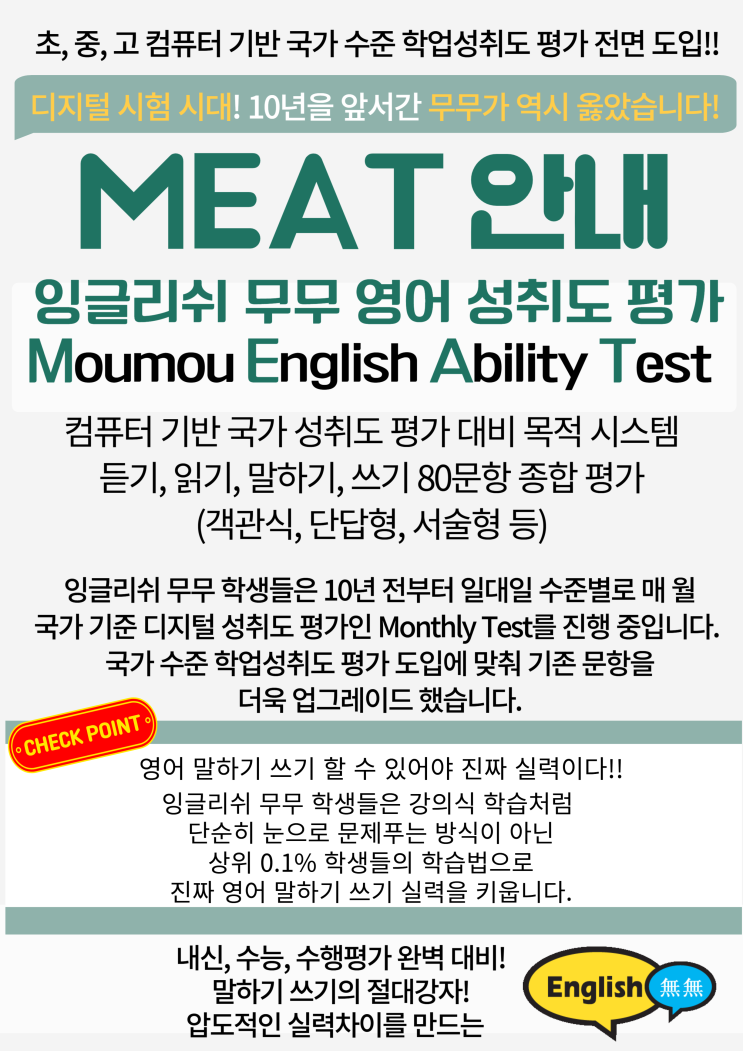 잉글리쉬 무무 영어 성취도 평가 (MEAT: Moumou English Ability Test) 잉글리쉬 무무 프로그램에 따라 일정 기간 학습을 진행한 학생들의 영어 실력을 종합적으로 확인할 수 있는 인증 평가 시스템! 공교육 교육과정에 제시된 학년별 학업 성취 기준을 토대로 학습 단계별 성취도를 측정하고, 부족 영역 파악 및 보충 기회 제공하기 위한 시험으로 국가에서 시행하는 컴퓨터 기반(CBT 방식) 맞춤형 학업성취도 평가에 완벽히 대비할 수 있는 온라인 평가 MEAT 는 수능 총 출제위원장, 교과서 총 저자급 교수 및 특목고, 외고 선생님 등 최고 영어 전문가들이 기획하고, 10억 이상 자본 투자된 영어 평가 시스템입니다! 1. 참가 대상 → 잉글리쉬....... <img src="https://blogthumb.pstatic.net/MjAyNjAyMjBfMjMx/MDAxNzcxNTc4NTIwNzYw.DPpIAXVSPVXYm5bYosKVRk3uoQU1XPZC0Wb5q3eSHs0g.taqjSn7s4UjRBwUNx6Pjy4EA3kJg2yVEFZbVVGoZWREg.PNG/MEAT_%BE%C8%B3%BB%B9%AE.png?type=s3" />
