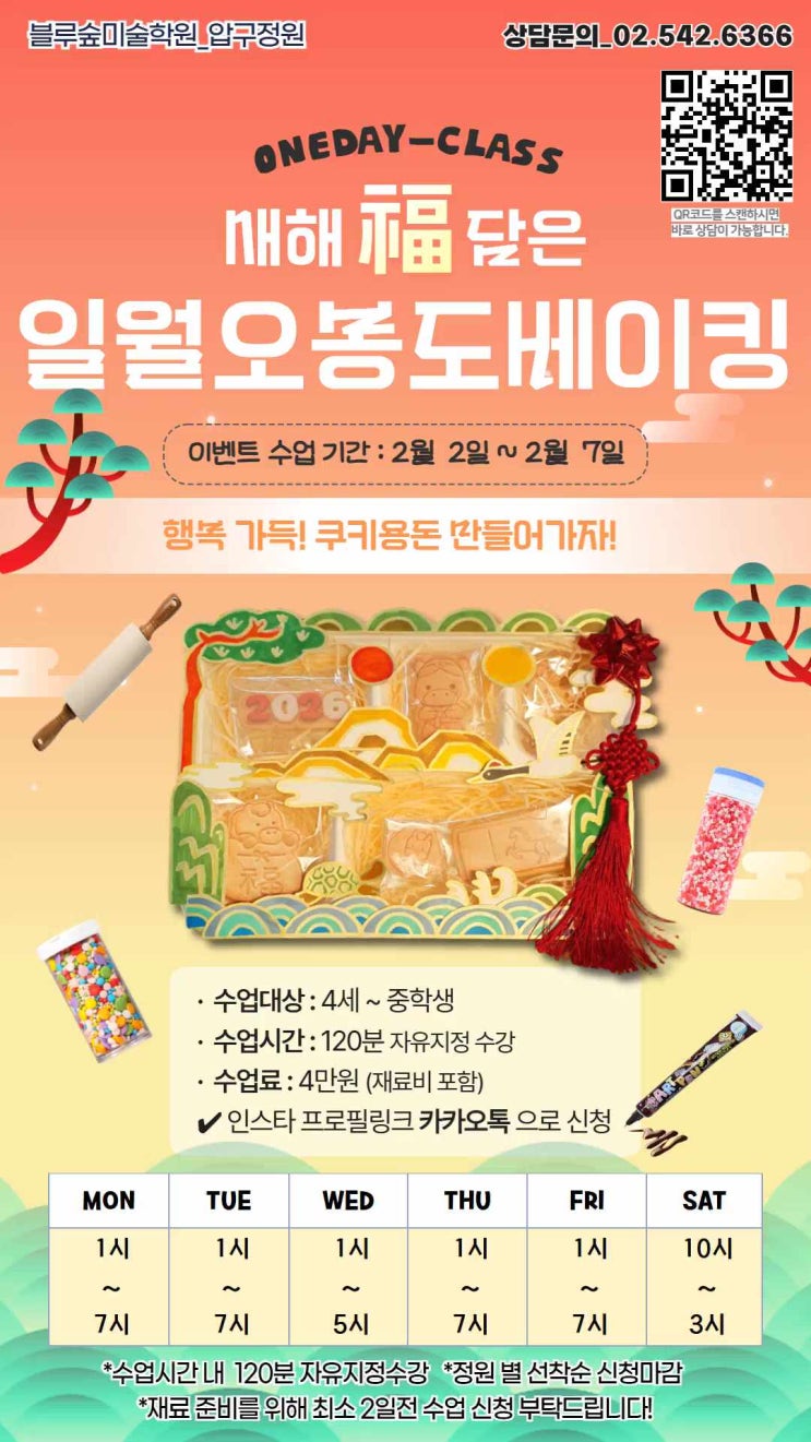 2026년 일월오봉도 베이킹 클래스 일월오봉도 베이킹 원데이 클래스 안녕하세요! 블루숲미술입니다 2026년 병오년을 맞아 특별한 이벤트를 준비해 보았는데요~ 아이들이 좋아하고, 처음 오는 친구들도 모두 함께 재미있게 참여할 수 있는 베이킹 원데이 클래스를 준비했어요! 이번 수업은 ✔️ 기존 수강생은 정규 수업 시간 내 참여 가능 ✔️ 신규 친구, 또는 친구와 함께 참여도 환영! ✔️ 블루숲에서 특별하게 준비한 베이킹 체험 수업입니다! 이번 베이킹 수업에서는 병오년에 어울리는 다양한 쿠키 모양을 만들어보고, 우리 전통 그림인 일월오봉도를 함께 살펴보며 새해의 소망과 의미를 담아보는 시간을 가져봅니다! 만....... <img src="https://phinf.pstatic.net/image.nmv/blog_2026_01_23_1001/0EwGGO3VvR_03.jpg?type=f480x480" />